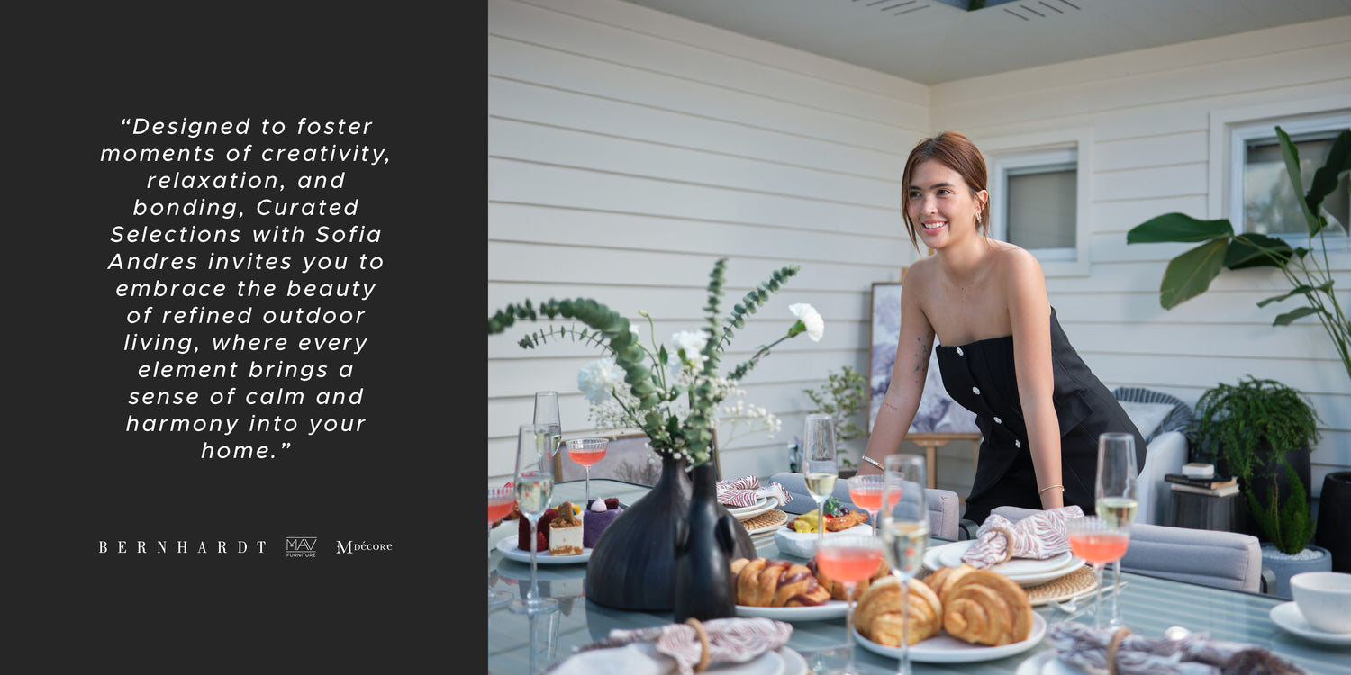 Inspired by her love for serene, neutral palettes and artistic details, Sofia has handpicked pieces from Bernhardt, Mav Furniture, and M Décore to transform her outdoor space into a peaceful sanctuary. Designed to foster moments of creativity, relaxation, and bonding, it invites you to embrace the beauty of refined outdoor living, where every element brings a sense of calm and harmony into your home.