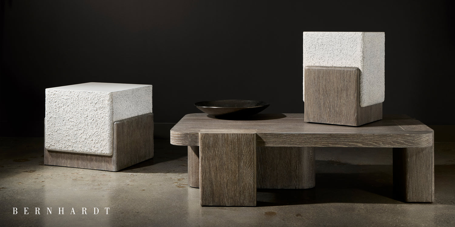 Bold forms are perfectly proportioned in the Monolith collection. Deeply textured stone and natural wood balance an elemental and authentic style.