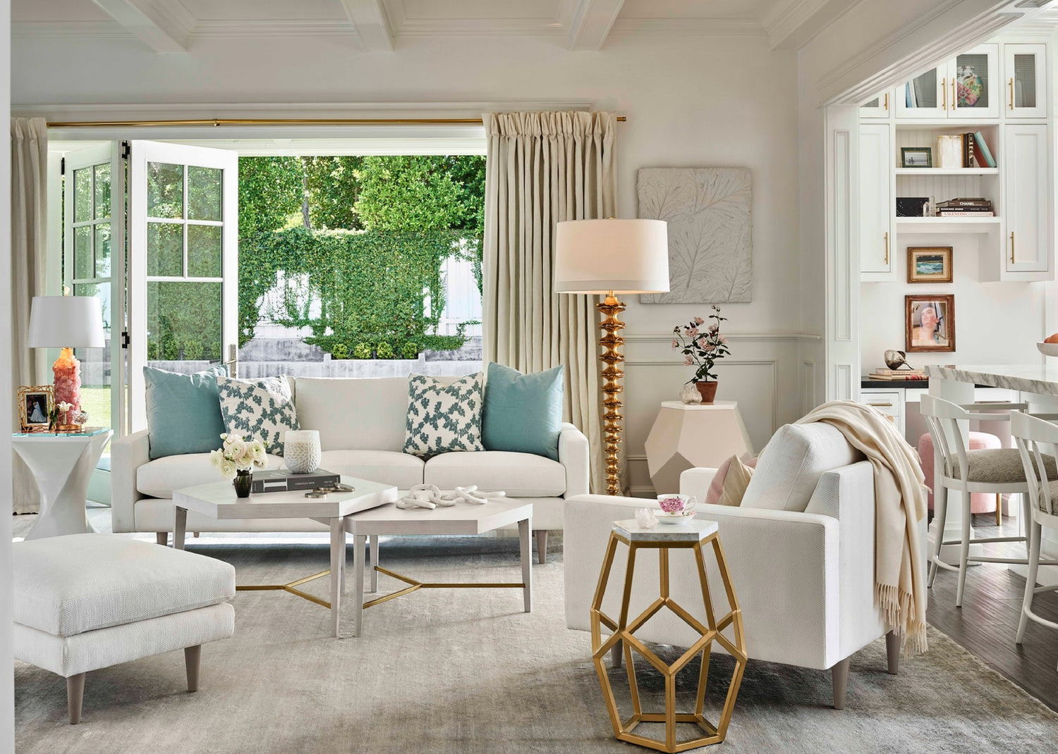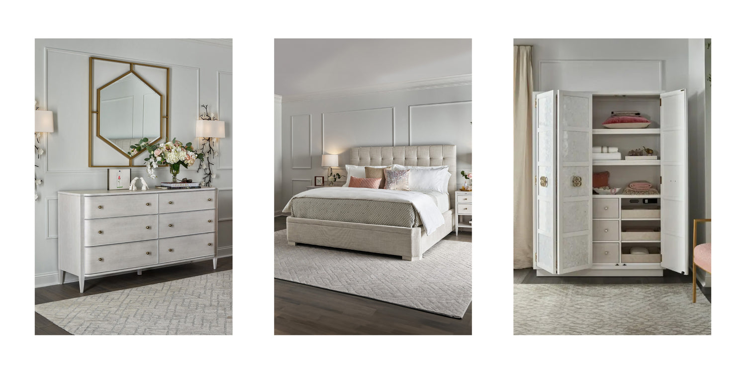 The design language is contemporary, with clean lines and geometric shapes complemented by feminine touches and soft pastel colors. The collection’s materials and textures are a perfect blend of luxury and comfort—think luxurious fabrics, mother-of-pearl inlays, bubble glass, geometric metals, and soft-gold accents.