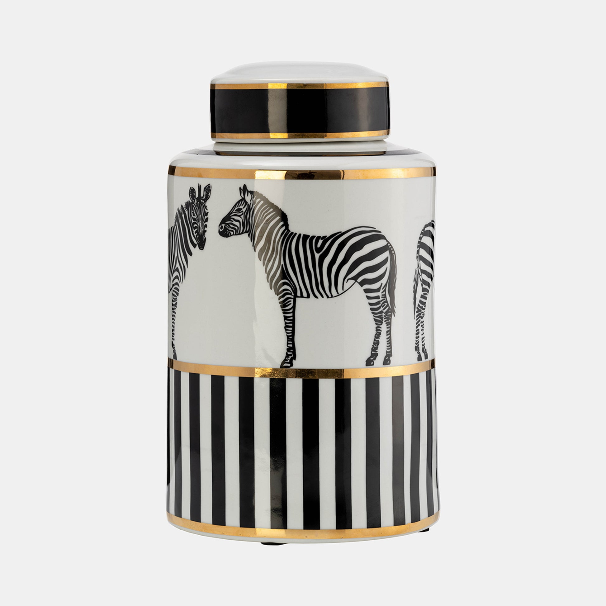 Zebra Ceramic Jar 12"H with Lid, White and Gold