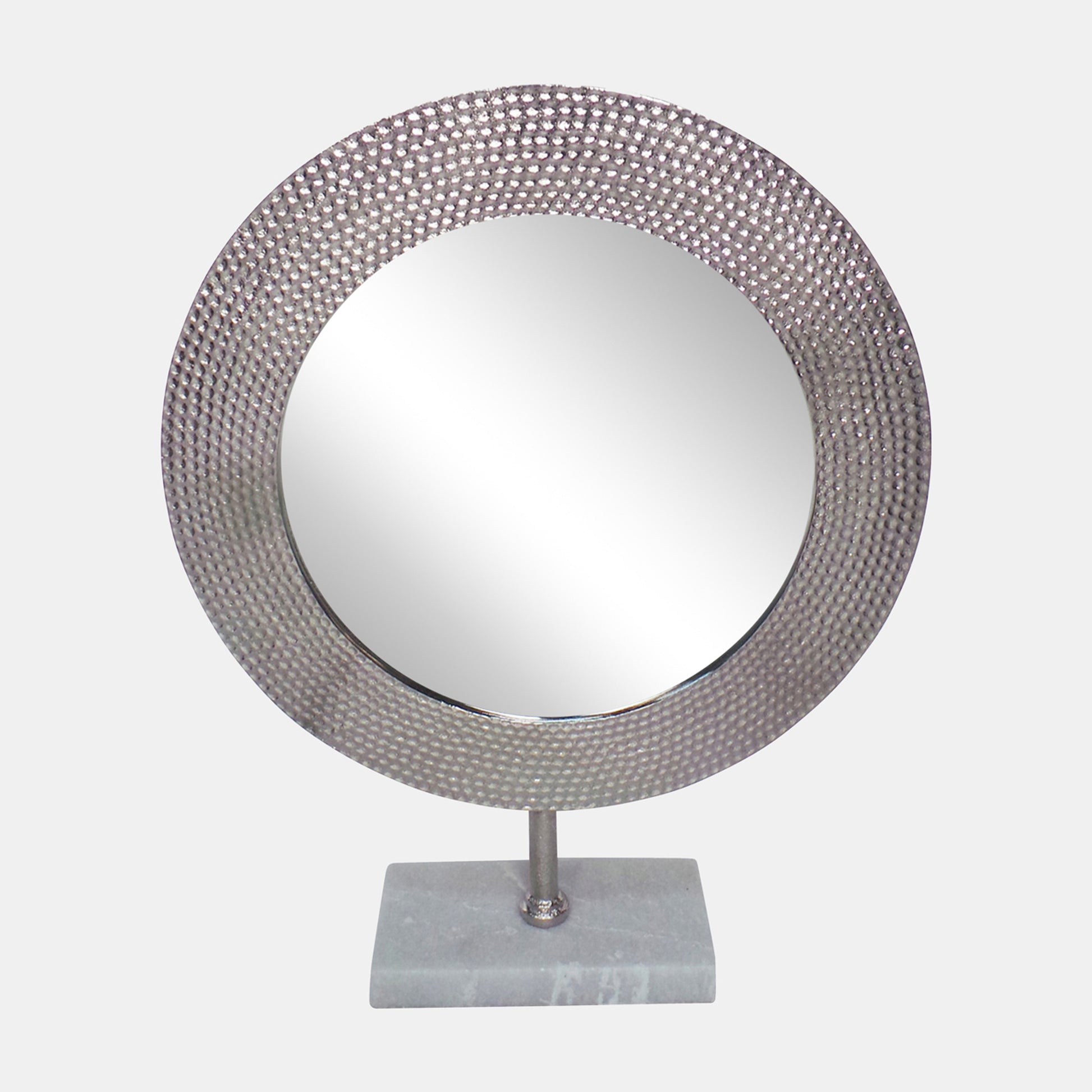 Adorn your space with the M Décore 21" Metal Hammered Mirror On Stand in Silver.