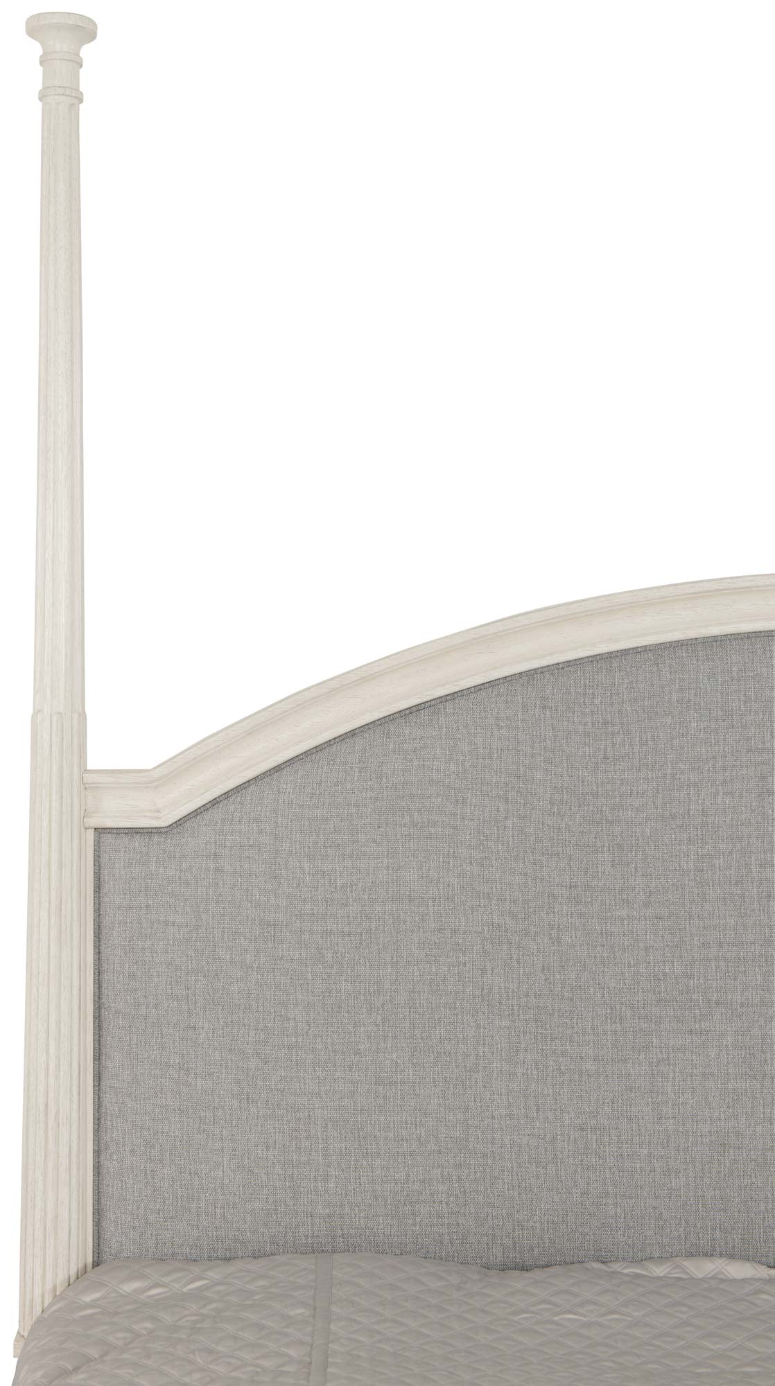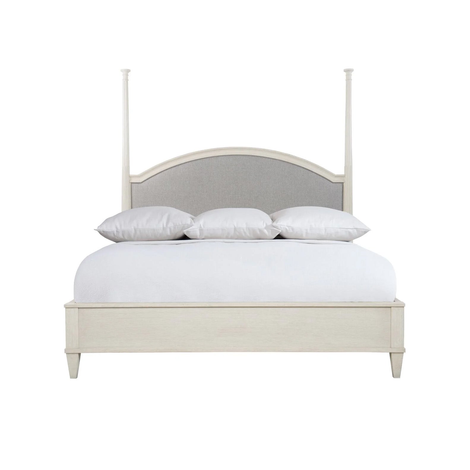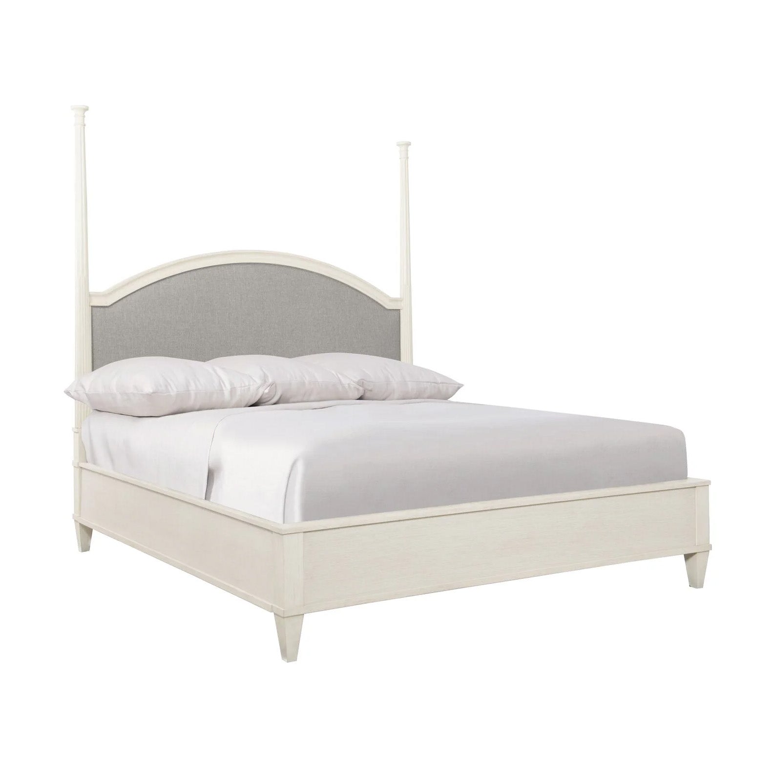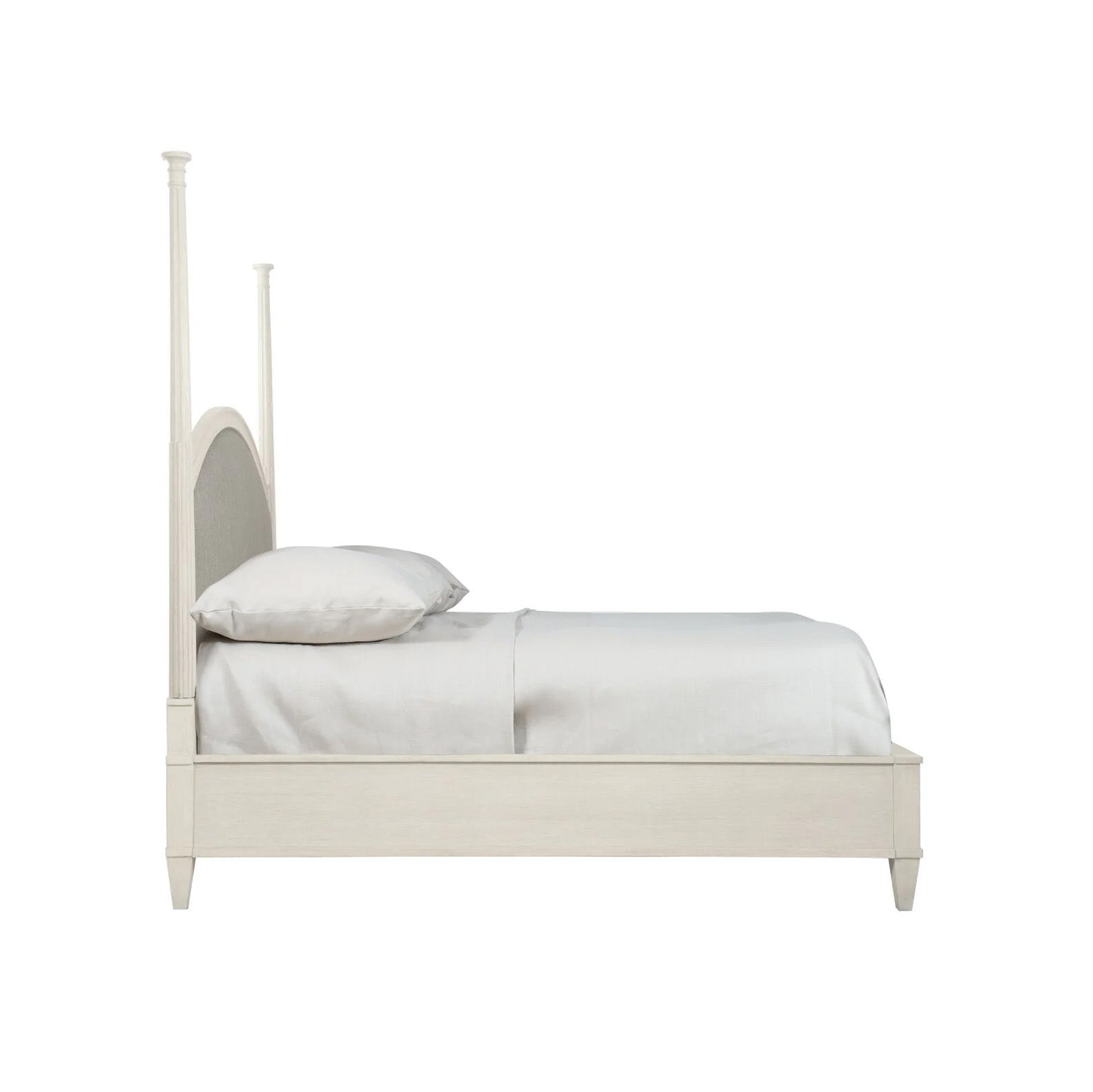 The upholstered wood-framed headboard has softly shaped and fluted posts and a high center arch.