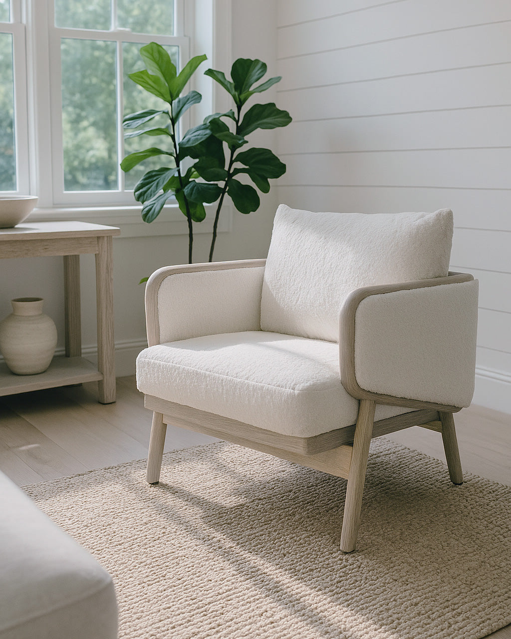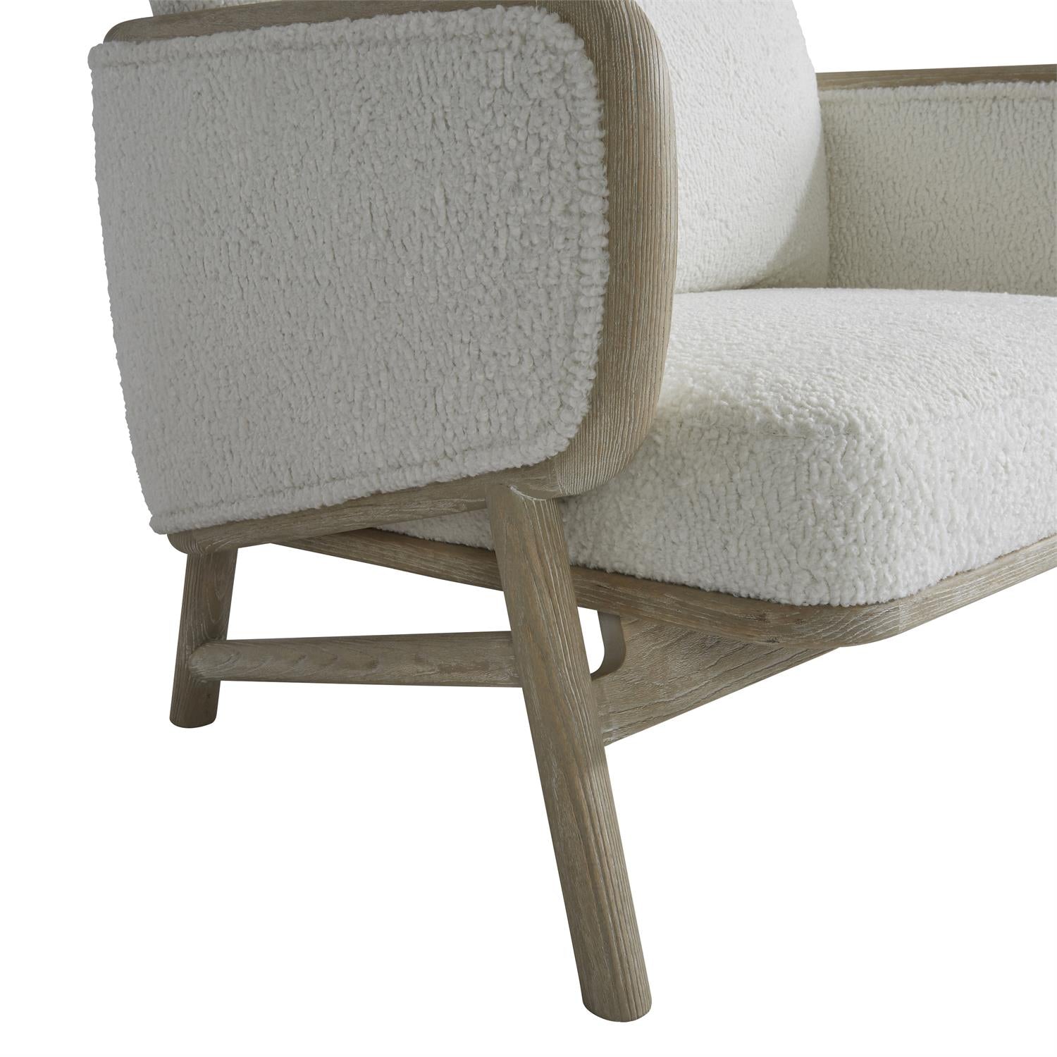 The Anders chair updates the traditional barrel chair shape with modern lines inspired by aerodynamic design. The back wraps around in a swoop of wood-framed fabric, creating curved arms that are connected to the base and legs in a Flaxen finish. The look is both contemporary and nostalgic.