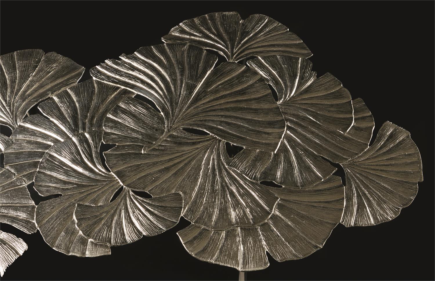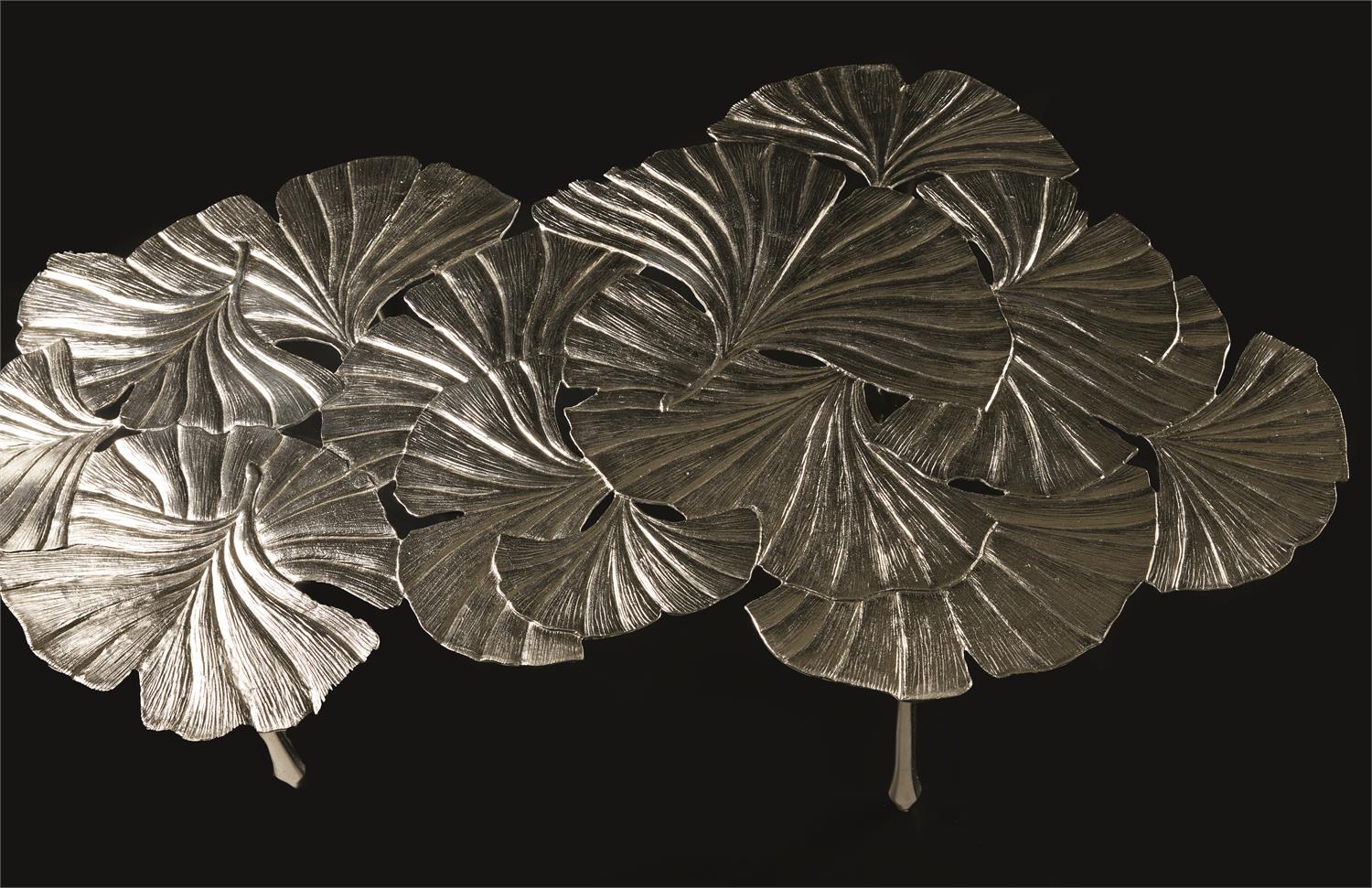 Crafted from cast aluminum in a satin nickel finish, this elegant cocktail table features a unique ginkgo leaf motif.