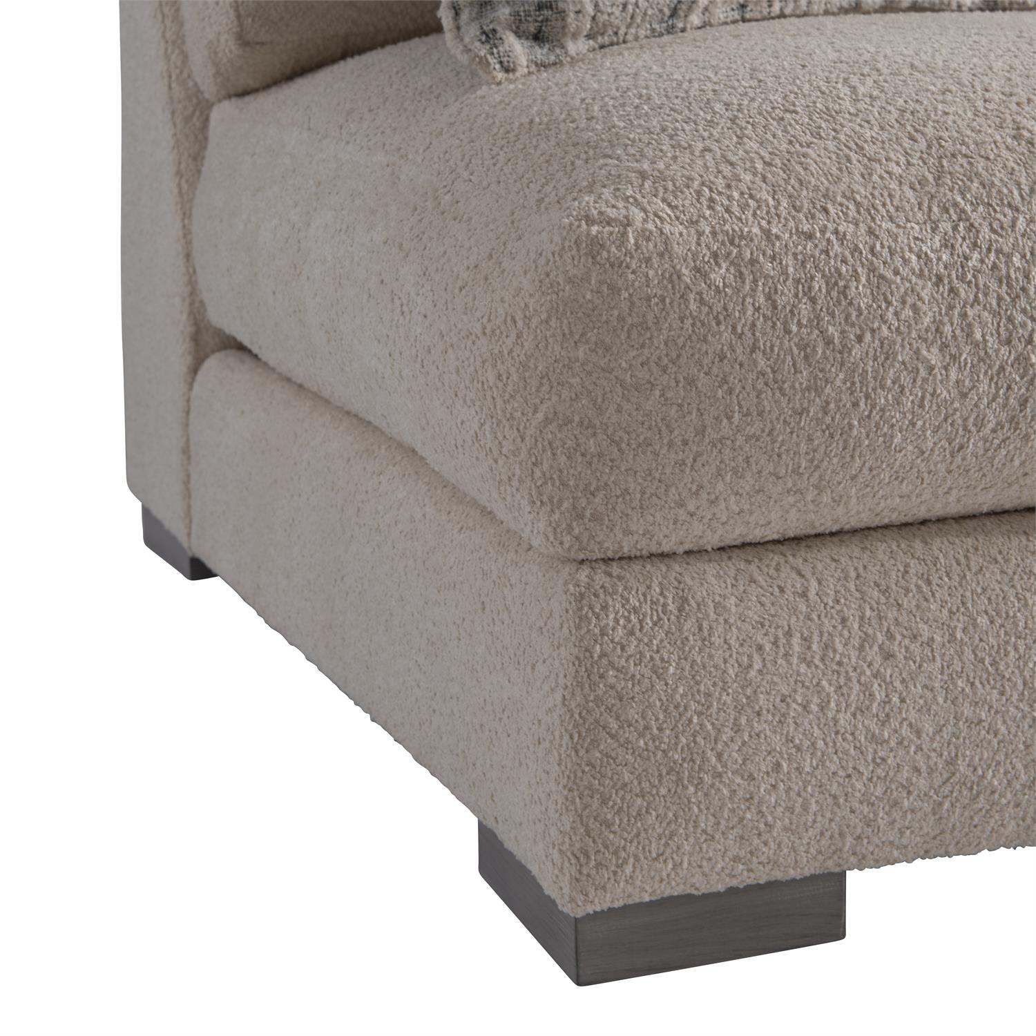 The Arles sofa goes to great lengths to showcase its novel, armless design. Its 92-inch width is accentuated with a long bench seat and a unique single back cushion. The frame's back has a slight recline that offers even more comfort, and the block feet are available in any Bernhardt upholstery finish. Two throw pillows add to the luxe comfort.