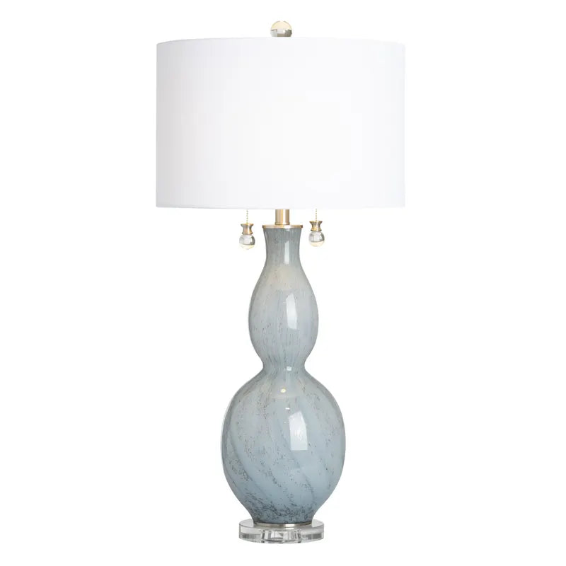 At the heart of the Aurora Table Lamp is its exquisite hand-blown art glass body, showcasing a mesmerizing swirl of rich blue hues. Each piece is a unique work of art, capturing the essence of a swirling Aurora Borealis. Adding to the lamp's allure are the double-pull chain switches, each capped with crystal accents to match the lamp's stunning crystal base. Topping this luminary masterpiece is a bright white linen shade, which diffuses the light in a soft, inviting manner.