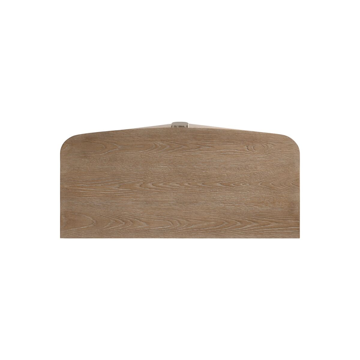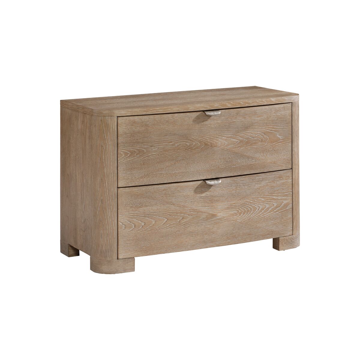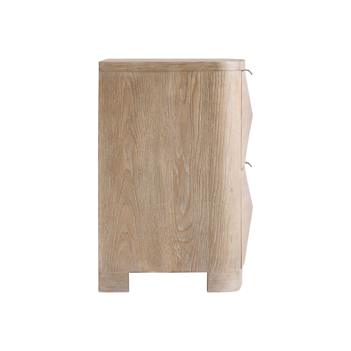 Dimensional pyramid shaping draws all eyes to the Aventura nightstand. A bow front design offers two drawers with tab pulls. Added function includes a two-port USB charging system on the back of the case. A Marcona finish adds a chic but rustic look as the perfect final touch.