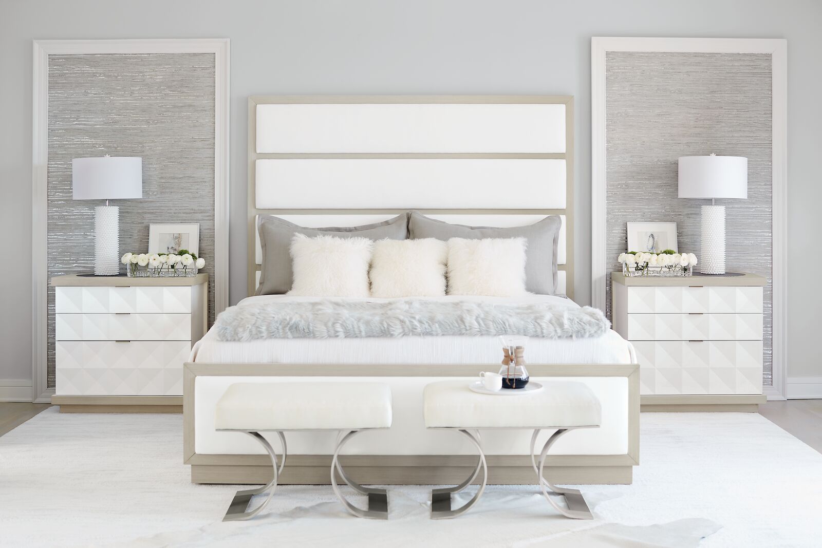 Beauty is in the curves. The Axiom bench features a solid stainless steel frame with curved, open end panels in a brushed silver finish. An upholstered box cushion makes the perfect surface or seat. With clean lines and a sleek form, this elegant bench offers glamorous transitional appeal.