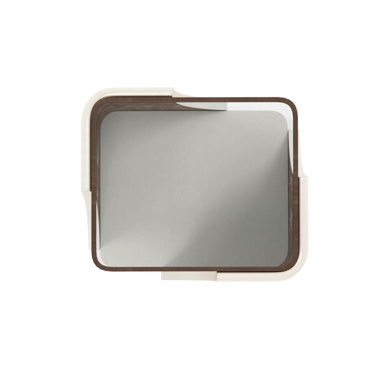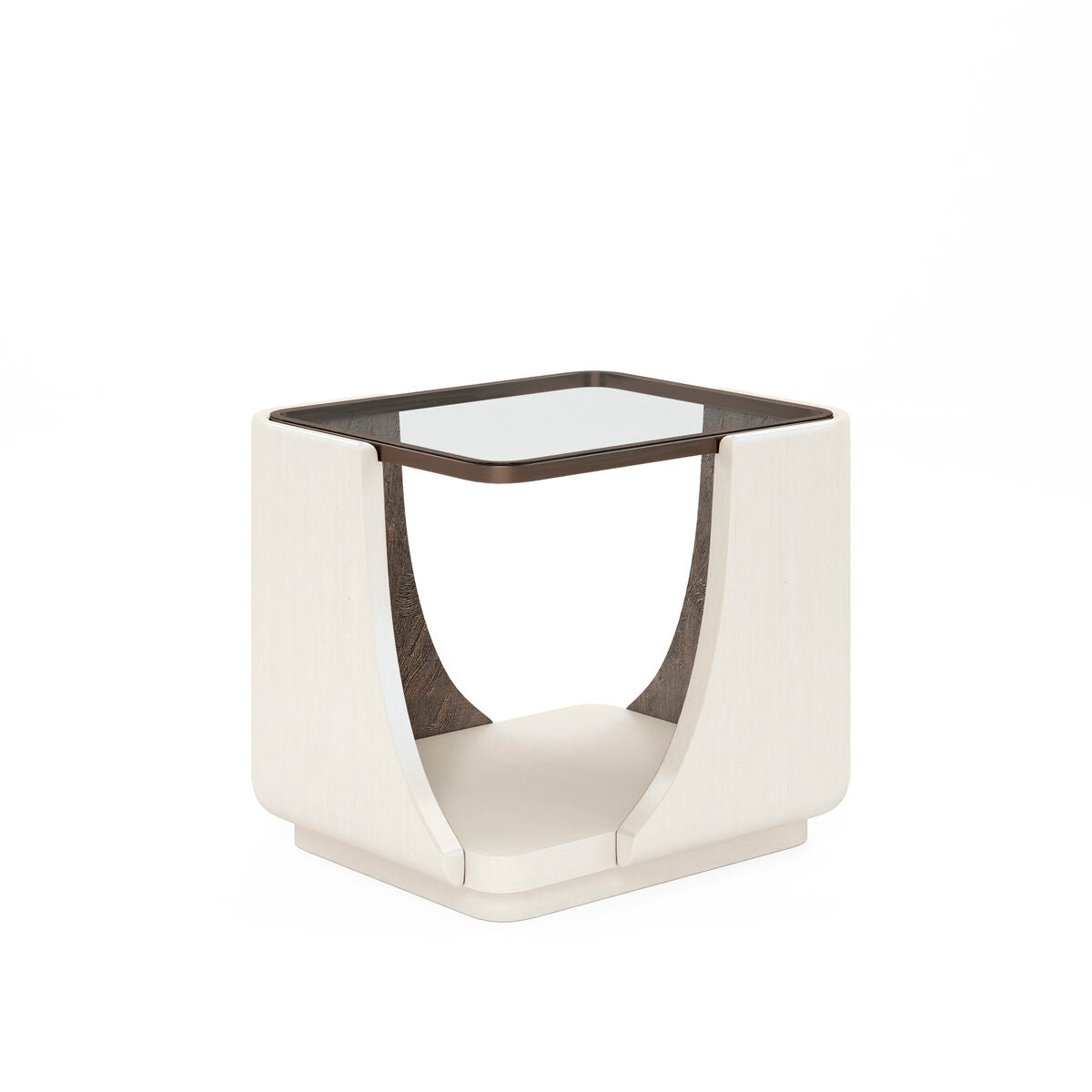 The rounded square glass top of this end table offers a view into its intriguing interior. A unique gesso inner surface finished in burnished bronze is enclosed by an exterior with a plaster-smooth warm alabaster hue. This high contrast accent piece adds a dash of drama to any living space.