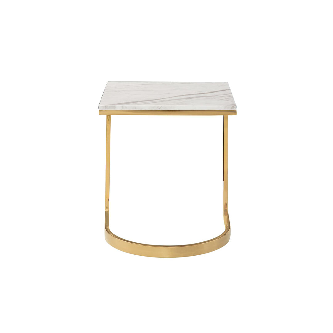 Featuring a clean design influenced by Art Deco style, the Blanchard end table showcases a stunning Jazz White marble top supported by a steel base in a lustrous polished brass finish. The juxtaposition of the square marble top with the semicircular base elevates the artistic appeal of this dynamic piece. With modern elegance and sophistication, this table effortlessly glamorizes any interior.