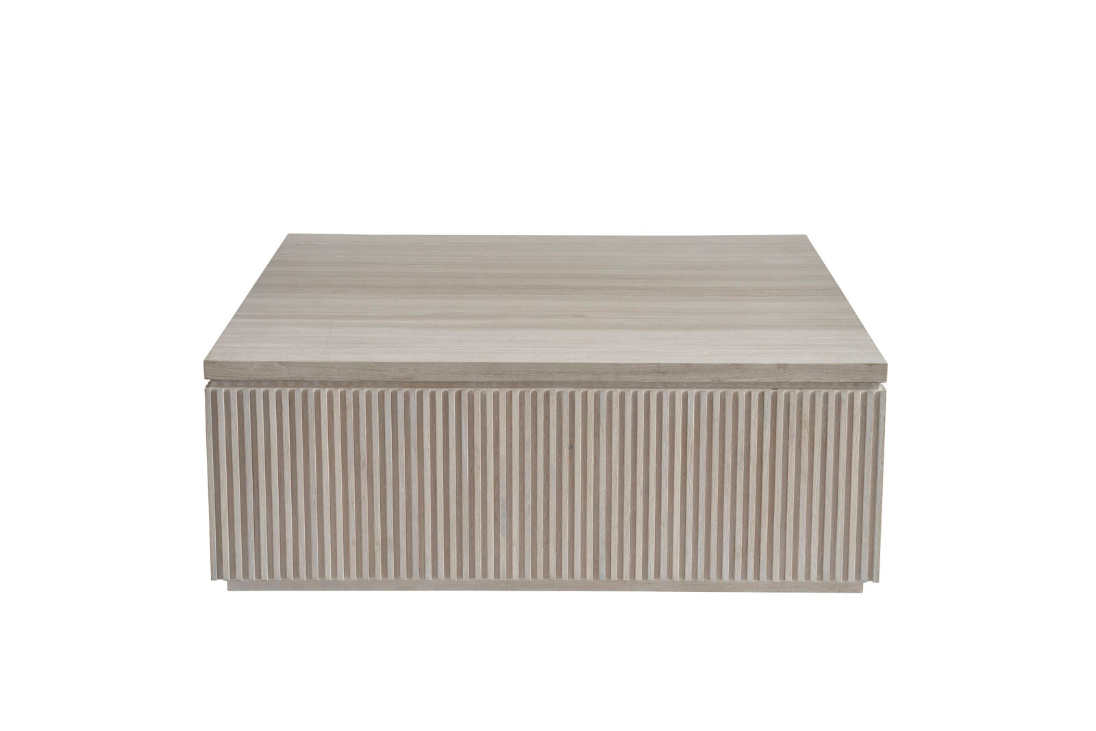 The Carmen Cocktail Table, a striking blend of natural beauty and modern design, features a sleek stone top and a distinctive base with a textured, indented design. Its smooth top provides a perfect surface for entertaining, while the casters allow for easy mobility, making it a versatile piece for any room.