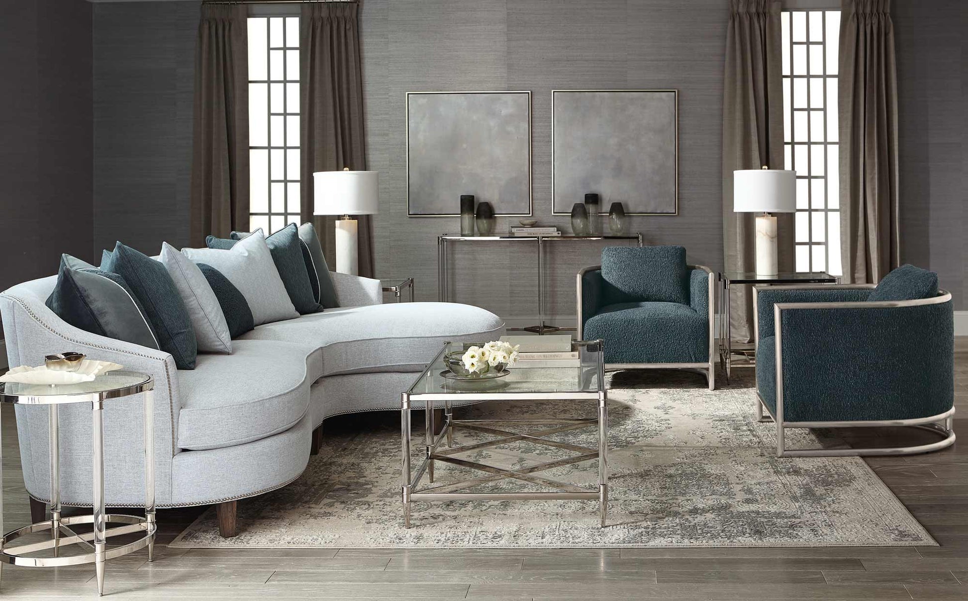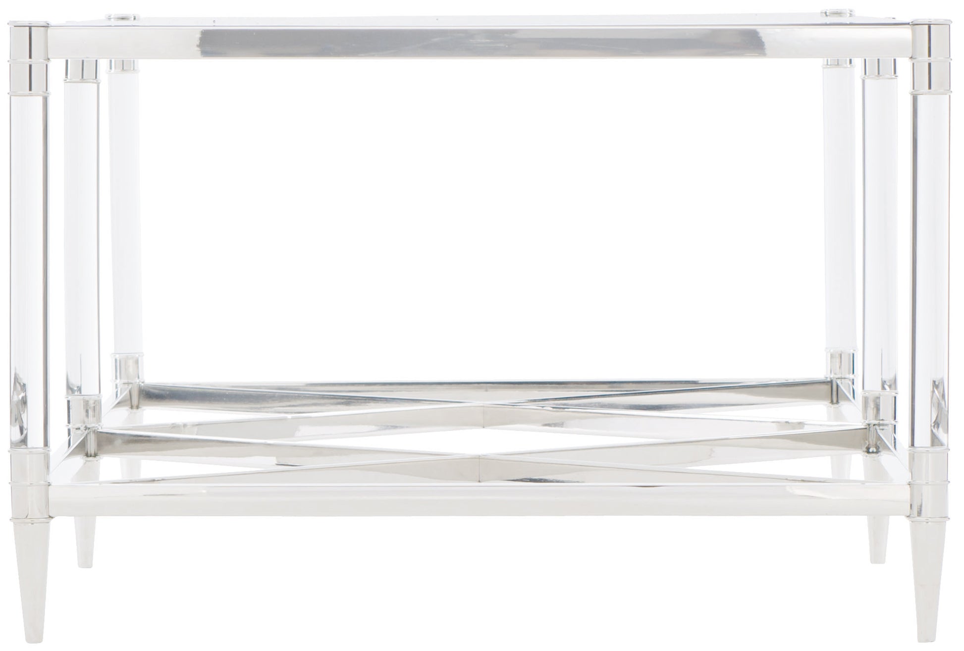 Bernhardt Occasional offers a range of upscale designs for luxe living spaces. The Celine rectangular cocktail table is sleek and stylish, joining clear and reflective materials in a unique composition. Crafted from polished stainless steel, the ultra-modern frame features X-shaped stretchers and acrylic leg posts. An inset tempered glass top allows a birds-eye view of the striking geometric stretcher design.