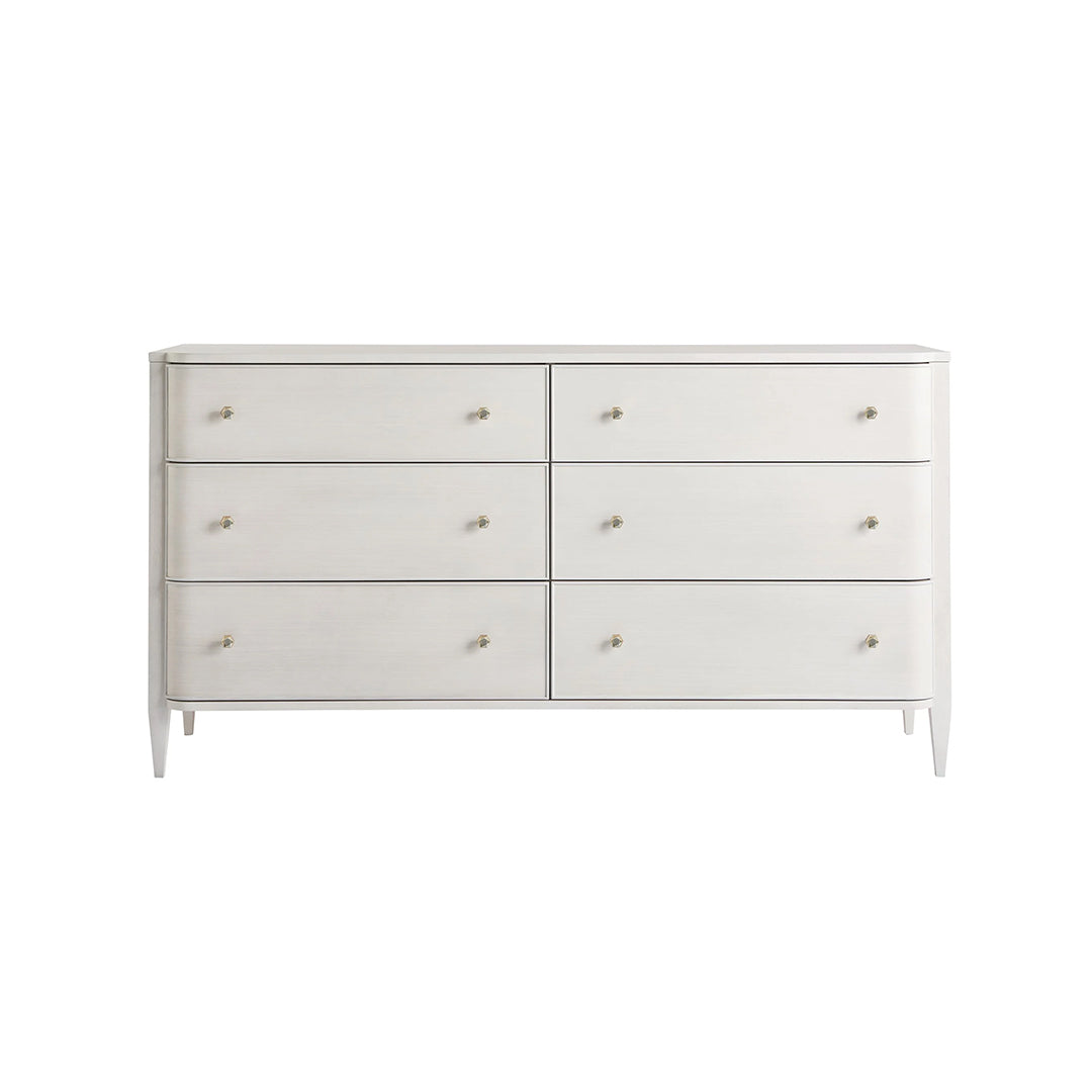 A clean Alabaster finish encases the Chelsea Dresser from the Love Joy Bliss collection by Miranda Kerr, which includes six drawers that are accentuated with champagne, hexagonal hardware for a simple and streamlined look.