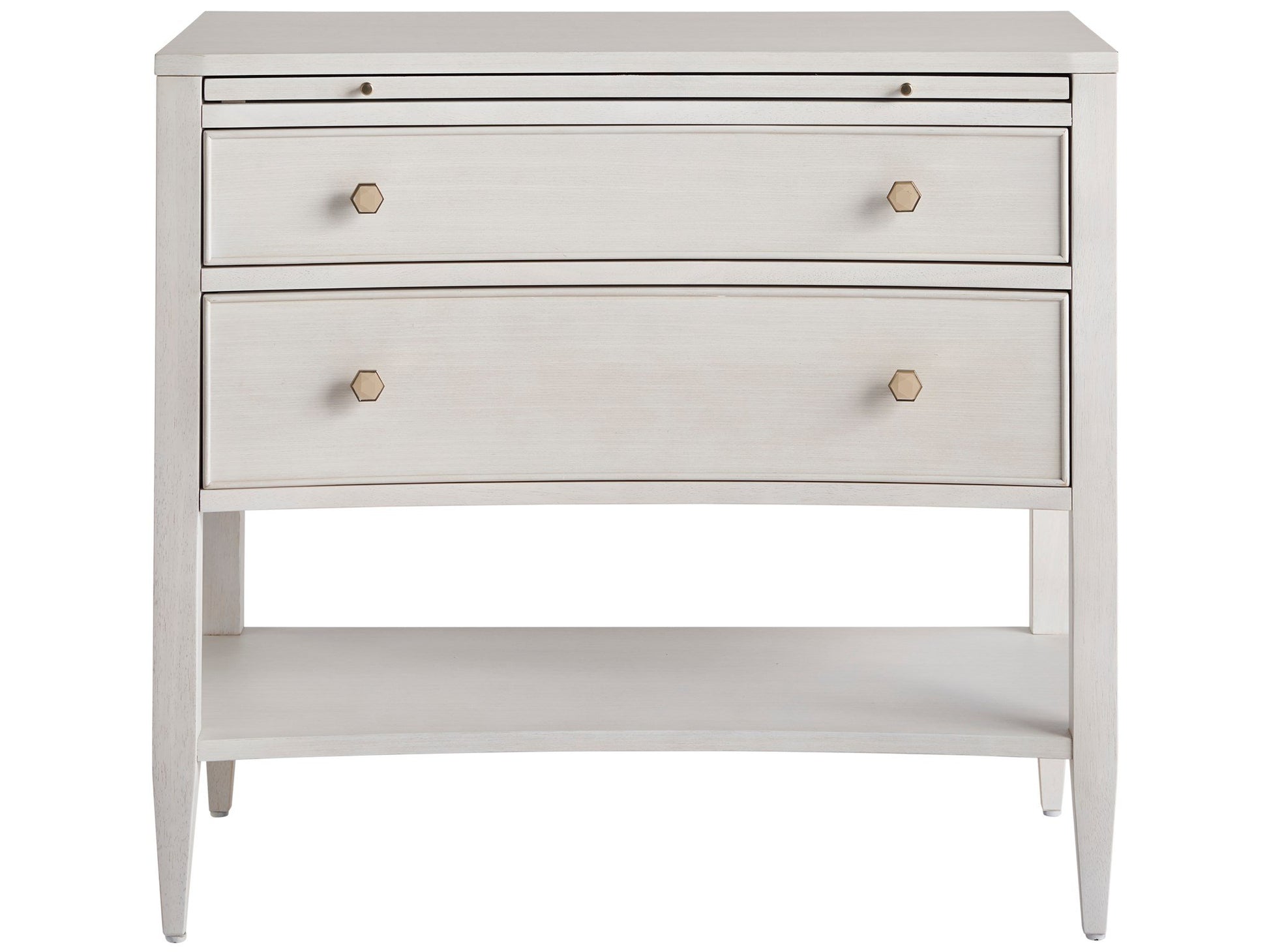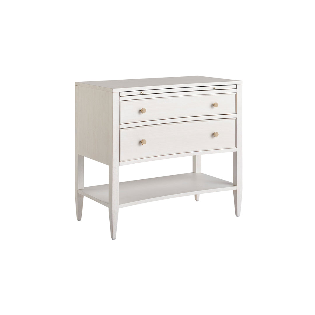 Wonderfully chic and sophisticated, the Chelsea Nightstand from the Love Joy Bliss collection by Miranda Kerr is encased in an Alabaster finish and designed with two drawers, and a laminated pull-out shelf. It is accented with champagne, hexagonal hardware for a simple, streamlined look.