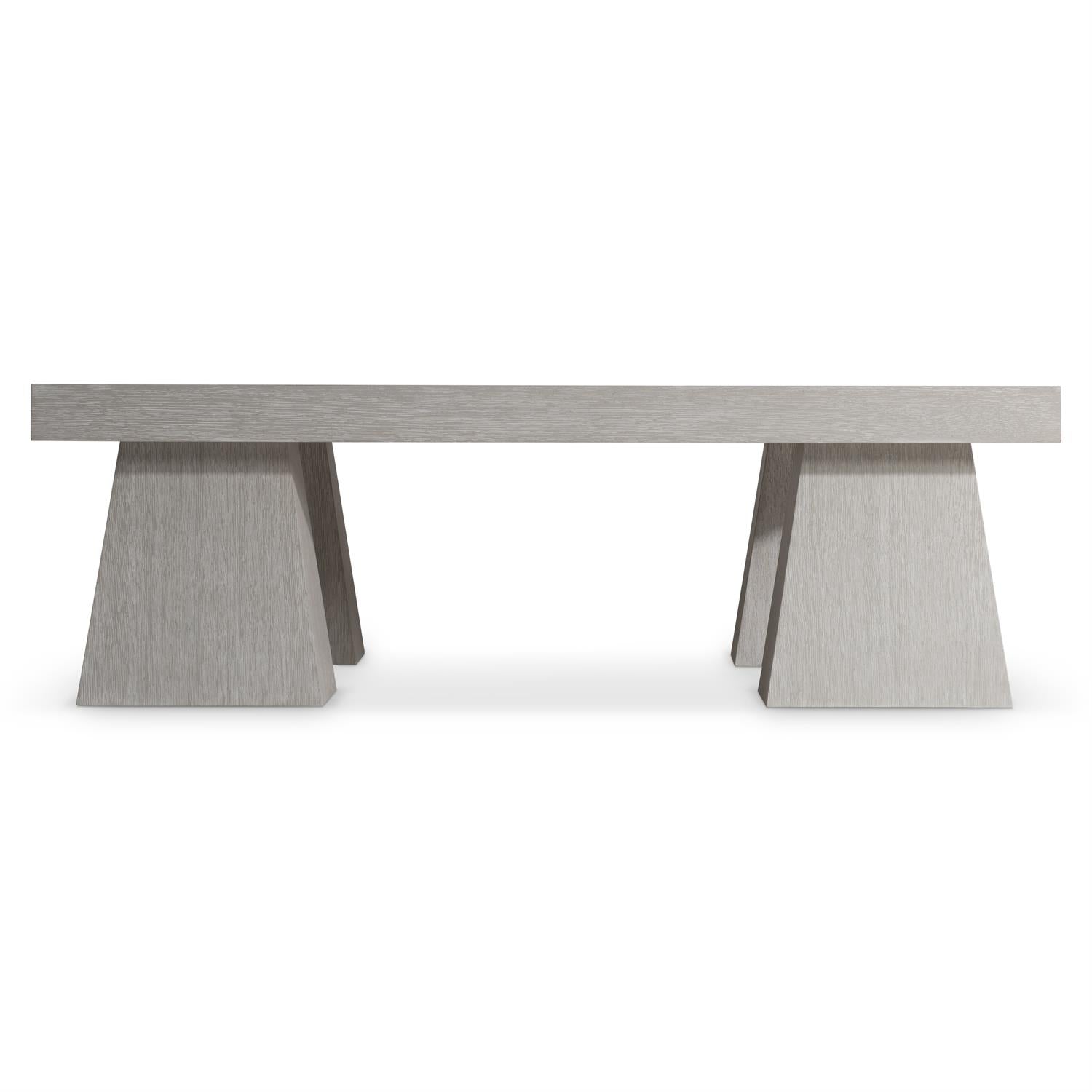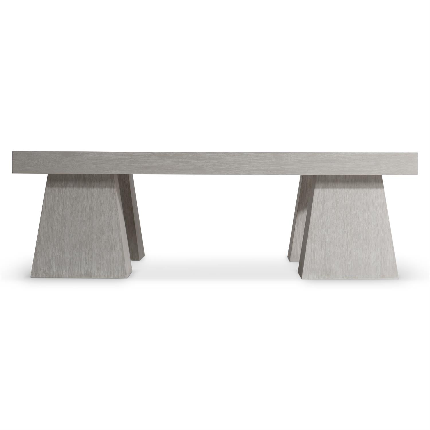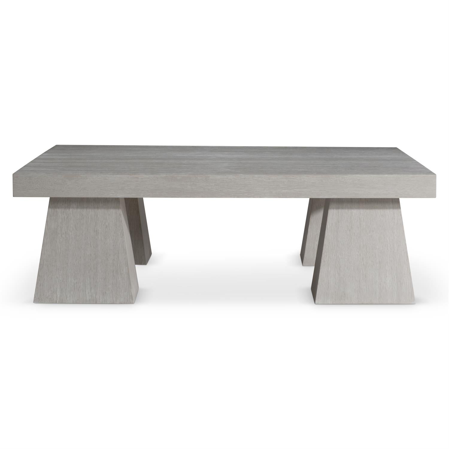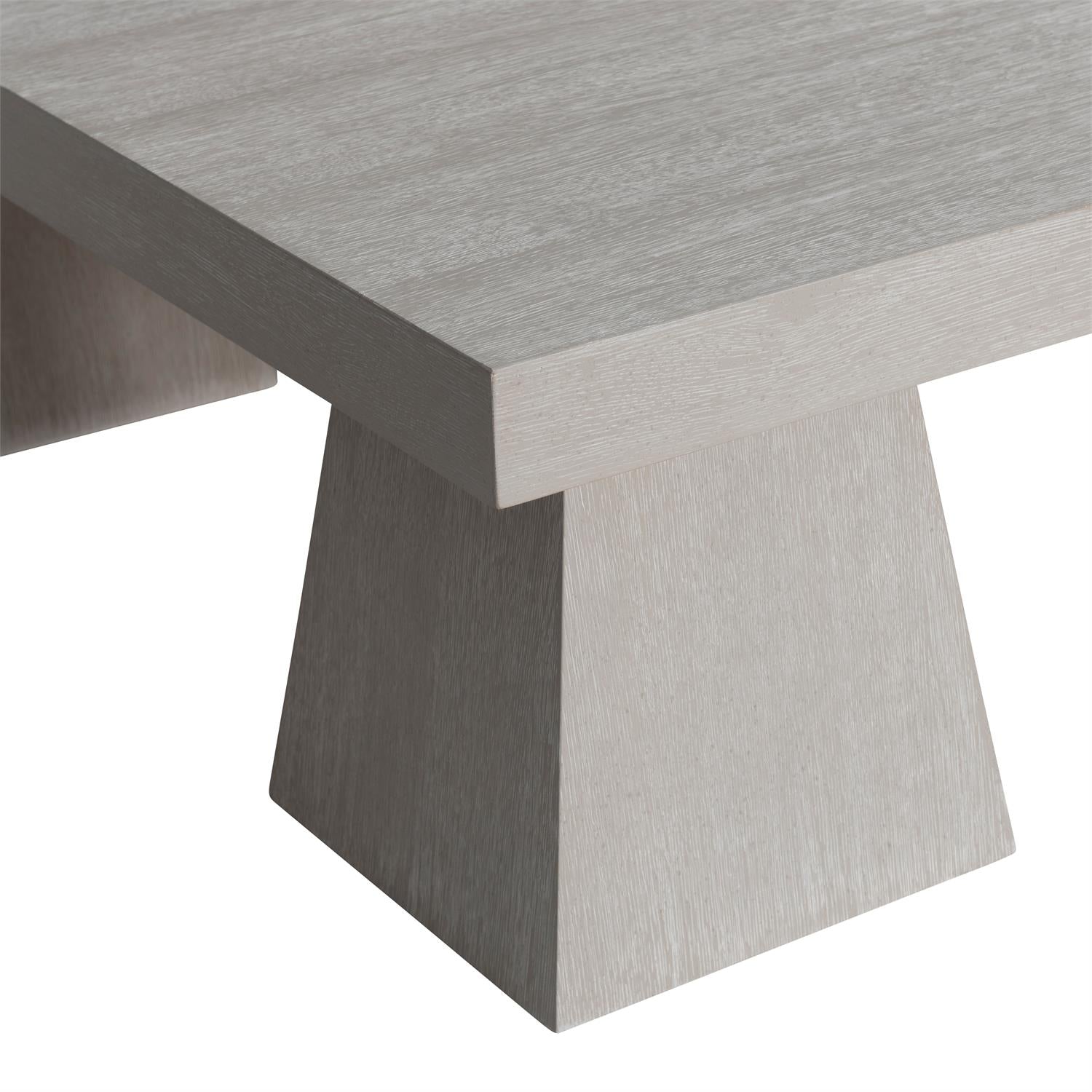The Conlin cocktail table showcases bold totemic design, with four block legs that taper at the top. They support a wide top that balances the strong look with a sleek style. The wire-brushed oak offers textural interest.