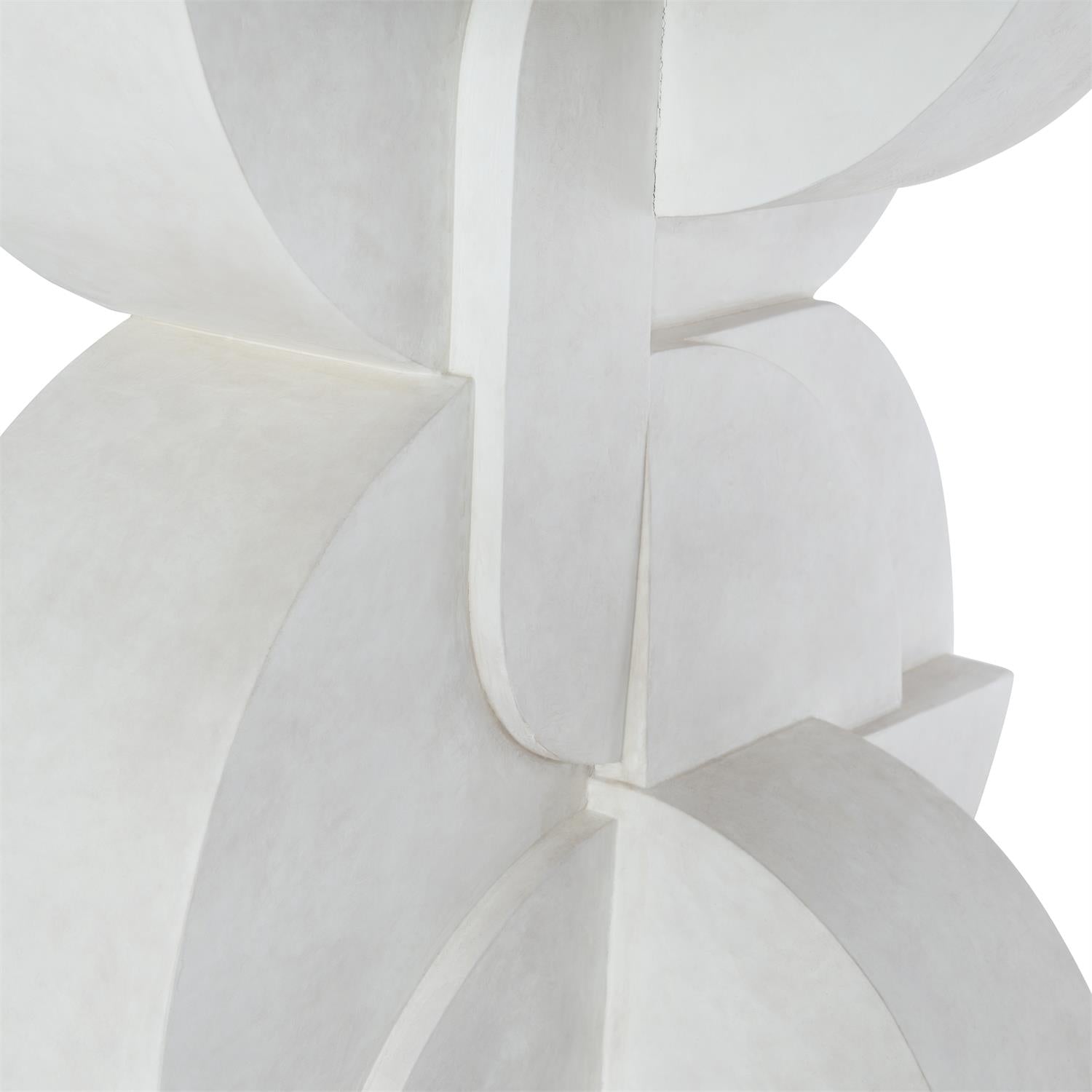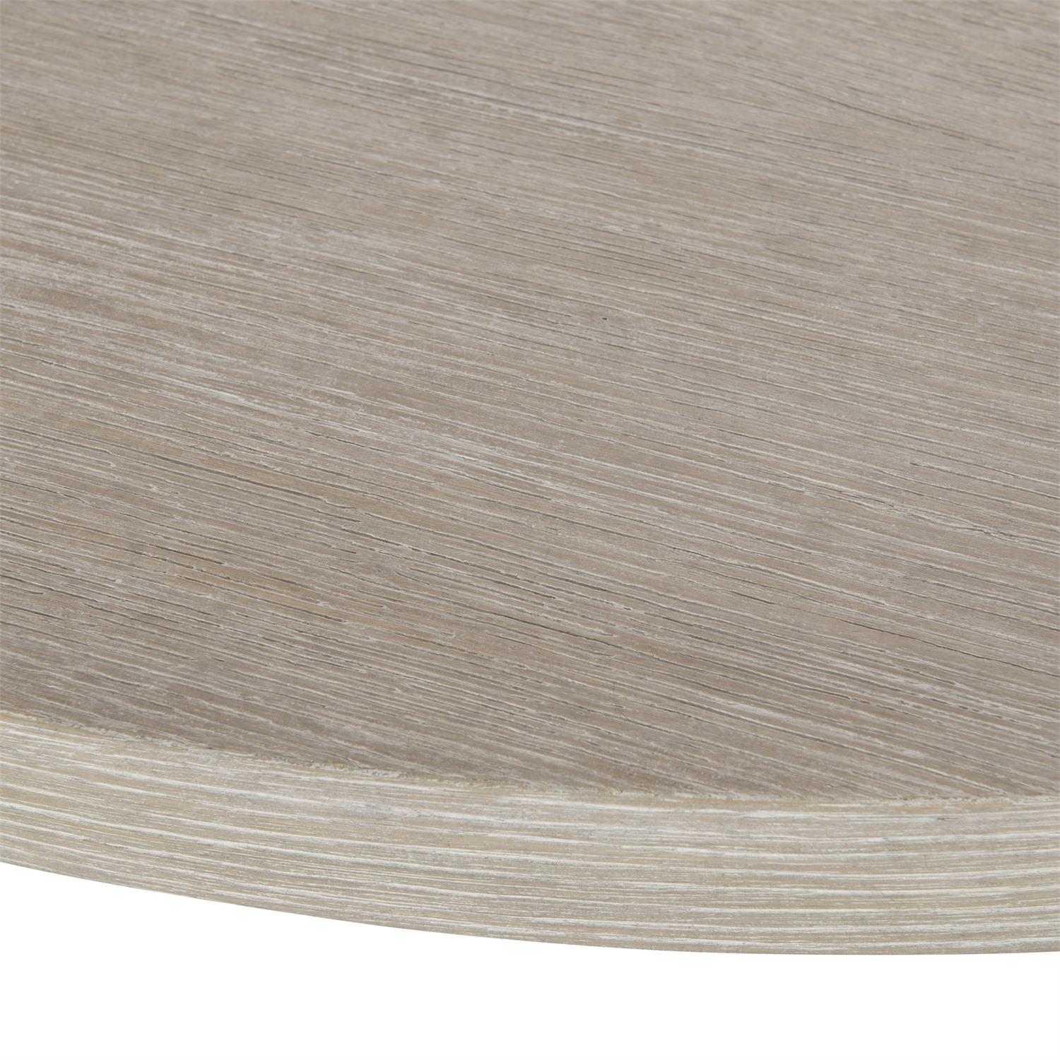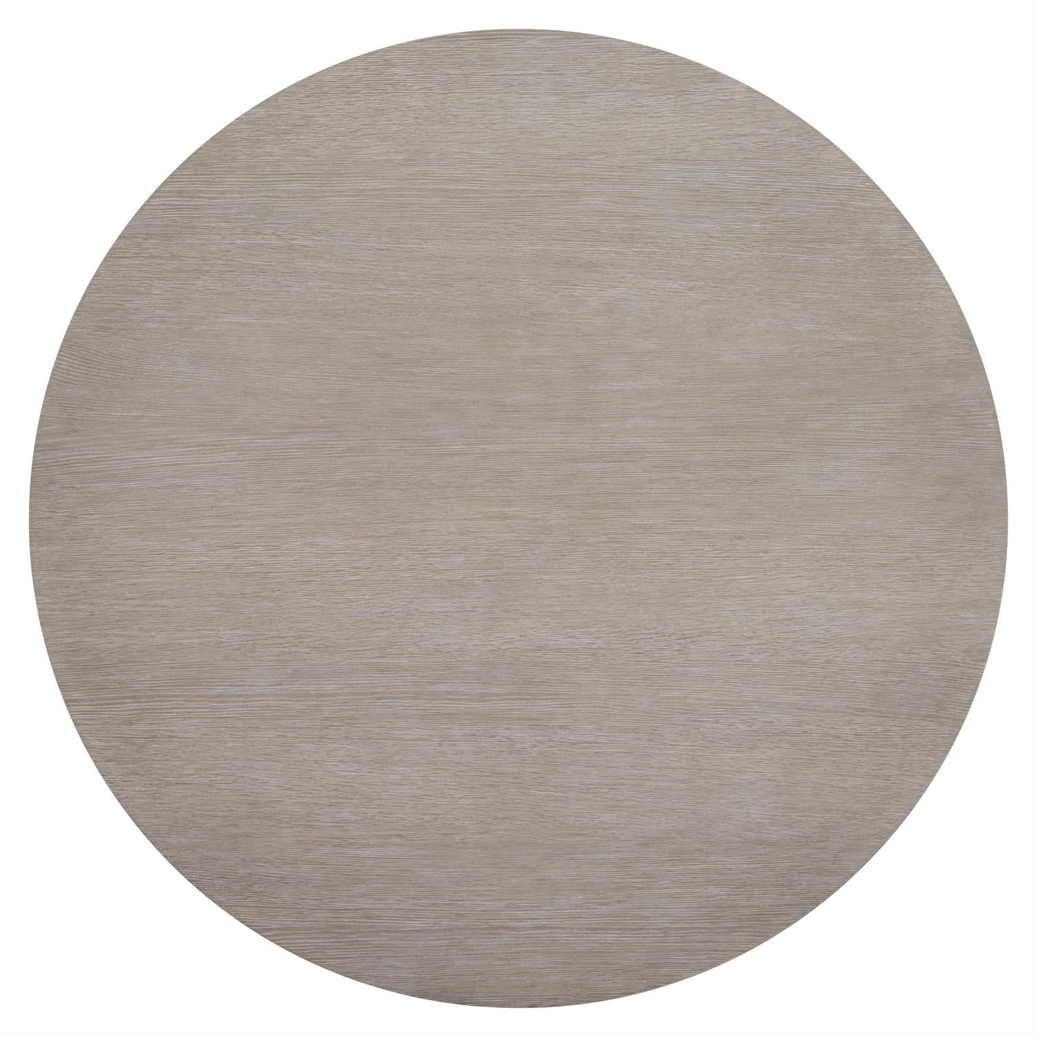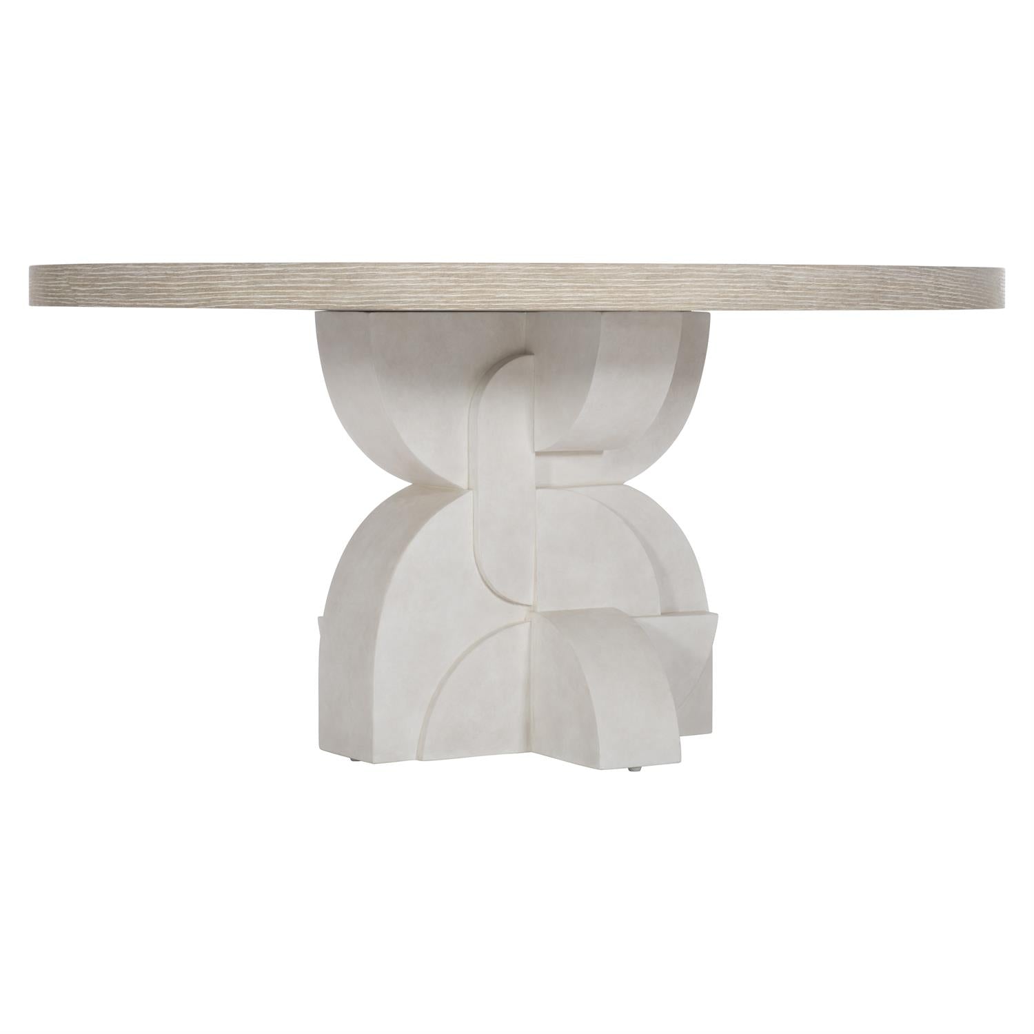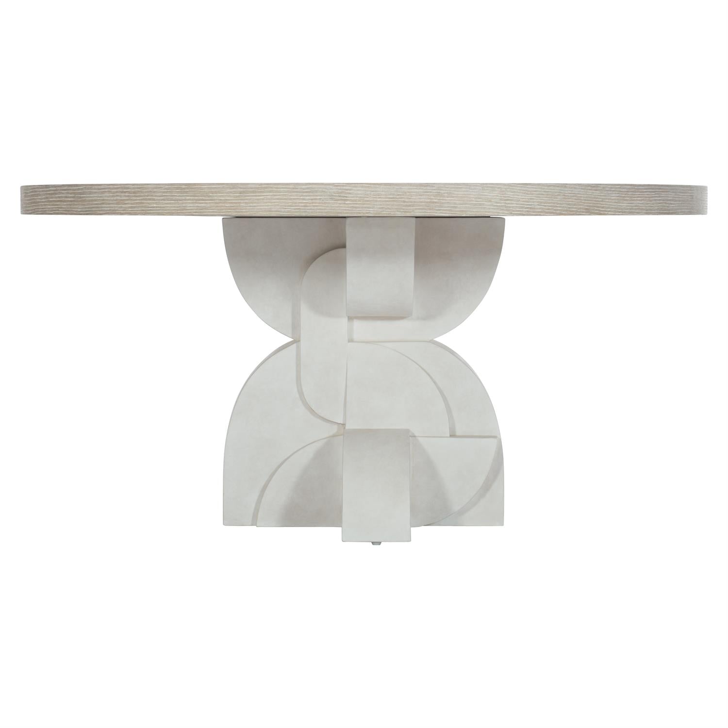 A totemic pedestal base draws all eyes to the Constantin dining table. With inspiration from mid-century artist Brancusi, geometric shapes are stacked in cast resin to support a round oak top in a Flaxen finish. It's a sculptural work of art that also offers a functional purpose in the dining room, or as a center table in a foyer.