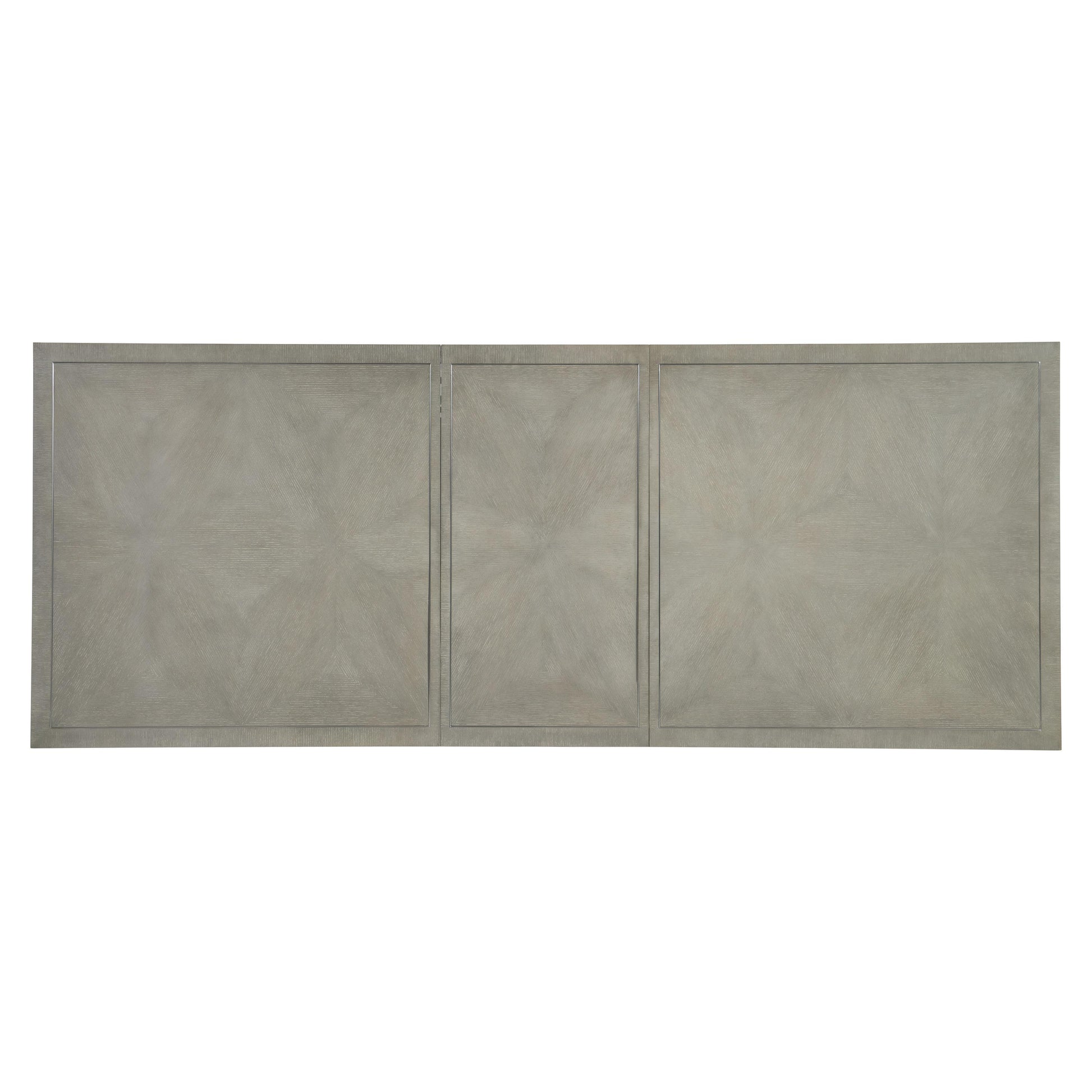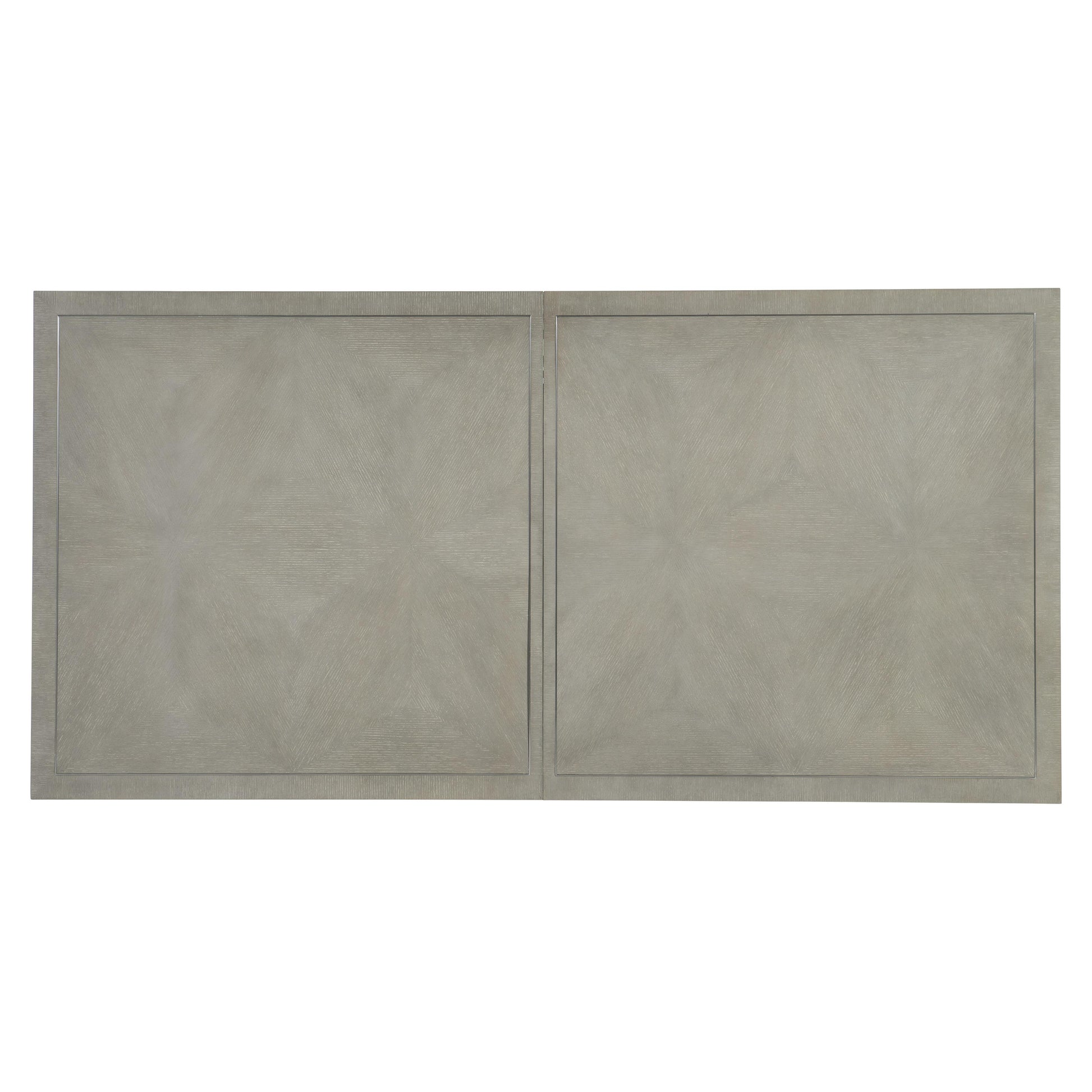 An understated, quiet beauty is showcased in the Cornelia dining table. Two octagonal cast resin pedestals have the look of wood grain in the Nebbia finish. They support a beautiful rectangular top featuring a parquetry top outlined with a brushed stainless steel metal inlay.