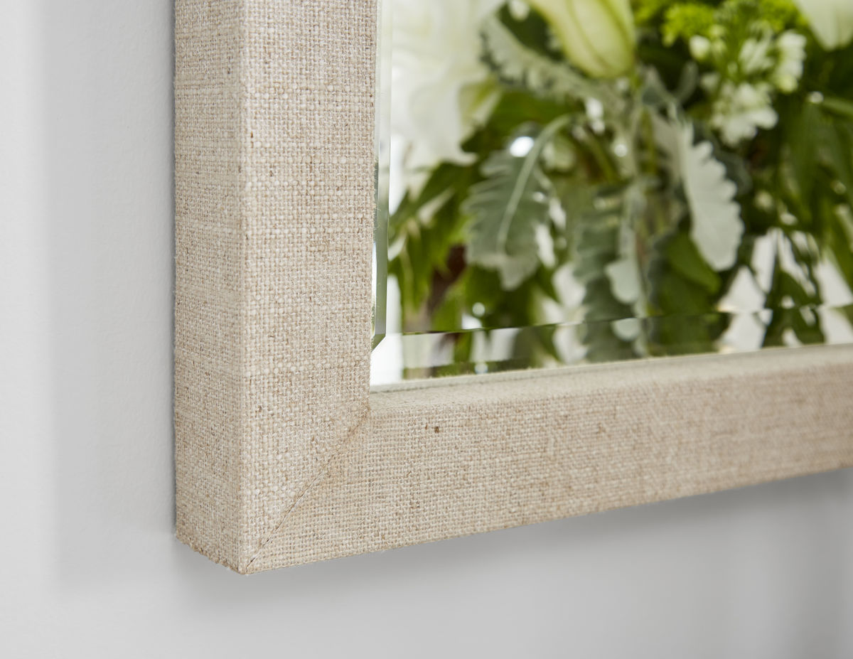 The bold geometry of the Cotiere Mirror frame is subtly softened by the addition of warm neutral woven fabric, providing a perfect complement to this casually stylish collection. Refined beveled glass accents the angular grace of this piece, reflecting the mid century modern-influenced aesthetic of this style.