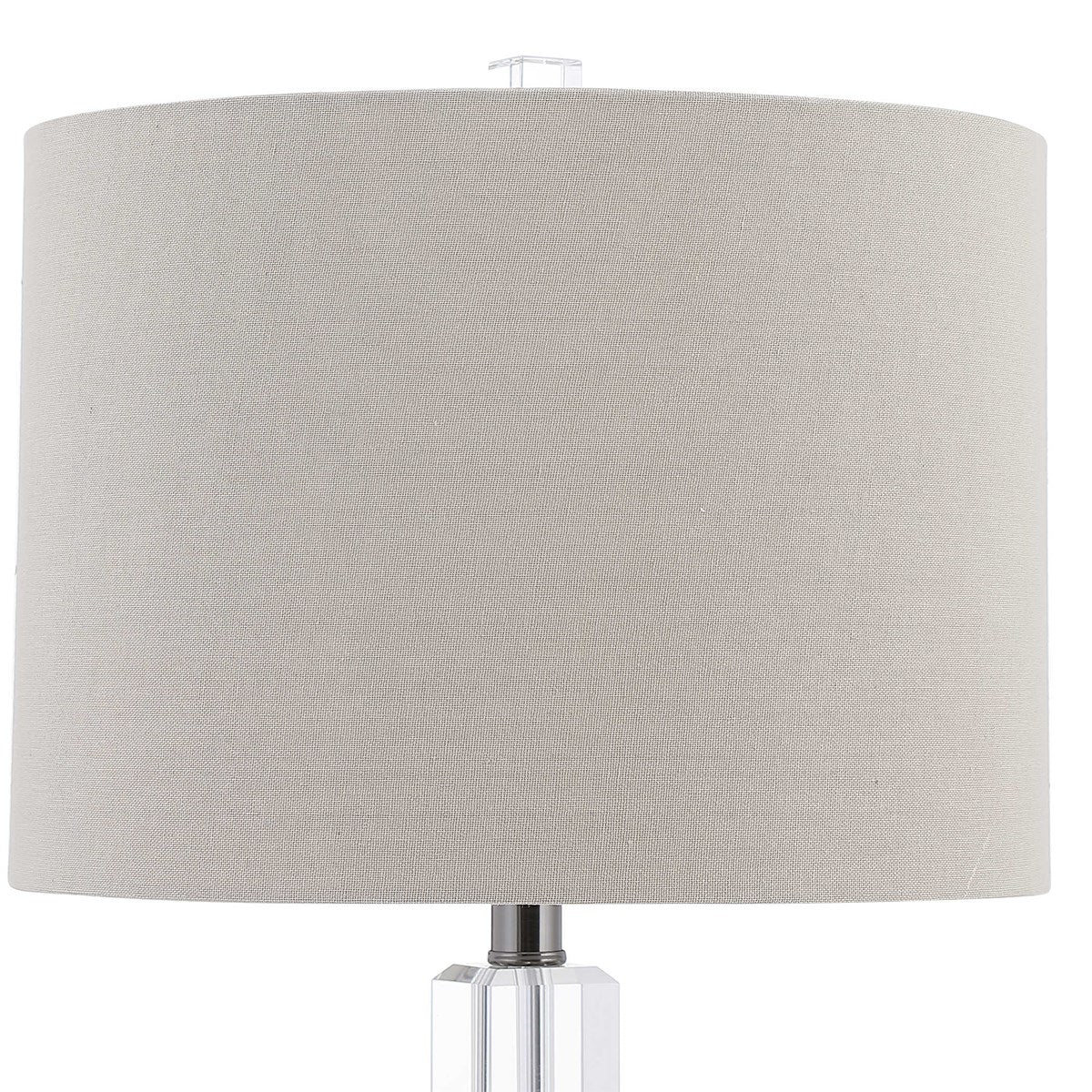 This elegant table lamp features stacked crystal separated by dark antique nickel accents. The round hardback shade is a light taupe linen fabric with light slubbing.