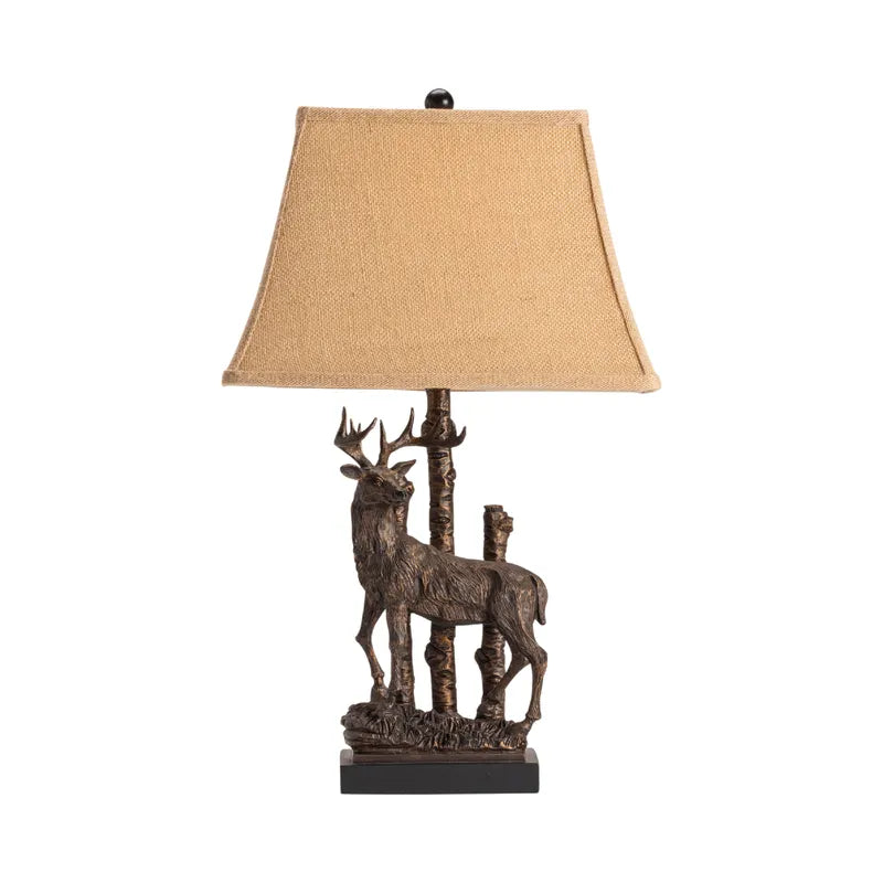 The Deer Table Lamp exudes rustic and outdoorsy style, making it a perfect addition to cabins, lodges, or any space where you seek to infuse a touch of wilderness-inspired decor. Carved from resin, this piece features a perched buck looking off into the distance amongst trees. The antique bronze finish is accented with gold highlights and topped off with a light-filtering, burlap shade. Look no further than this beautifully crafted addition to cast its warm and inviting light into your home.