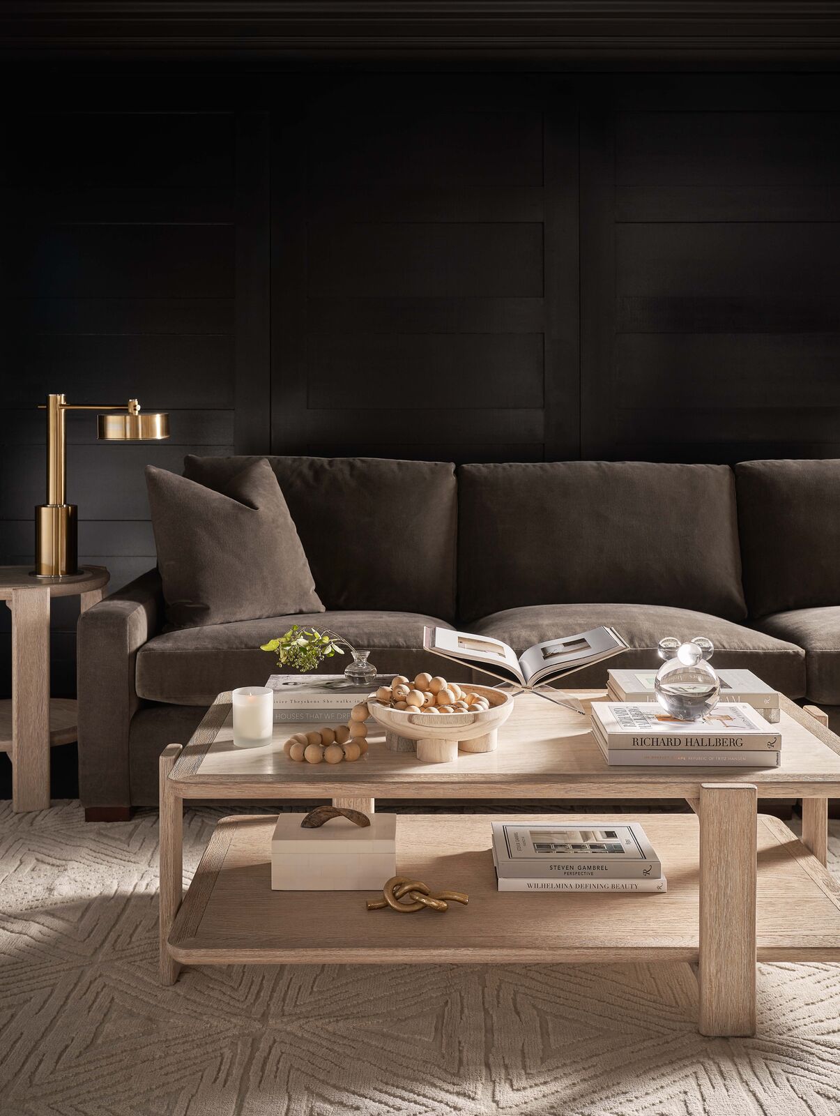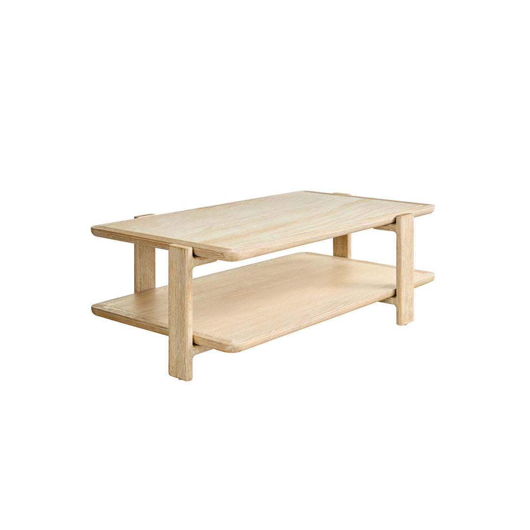 The Desert and Stone Cocktail Table presents a harmonious blend of textures and tones. The light Desert wood finish provides an airy complement to the cool, natural stone top, creating a sophisticated and inviting centerpiece for your living room.