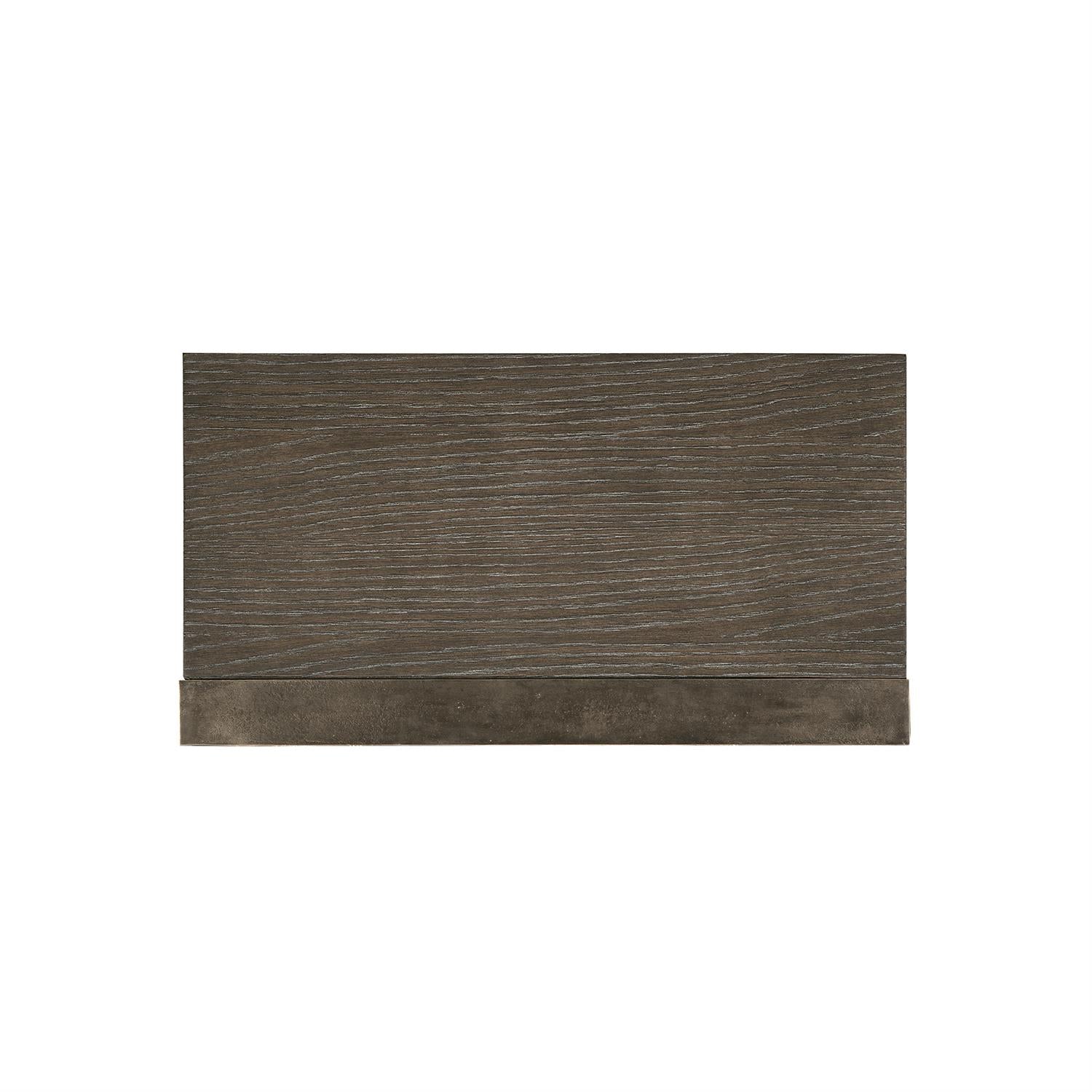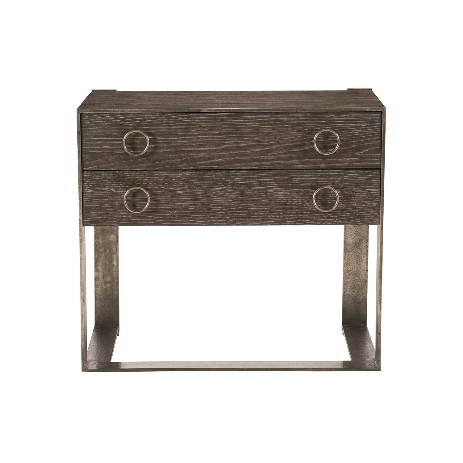 Bernhardt Interiors is a curated collection that offers high-design furniture with an eclectic edge. The Dixon nightstand features a minimalist exposed frame supporting two-drawers. With rustic and casual appeal, the nightstand is crafted from sandblasted oak in Weathered Charcoal finish that accentuates the woodgrain. Round metal pulls offer contrast to the linear design, while the Graphite finish on the aluminum frame adds texture and a touch of industrial chic.