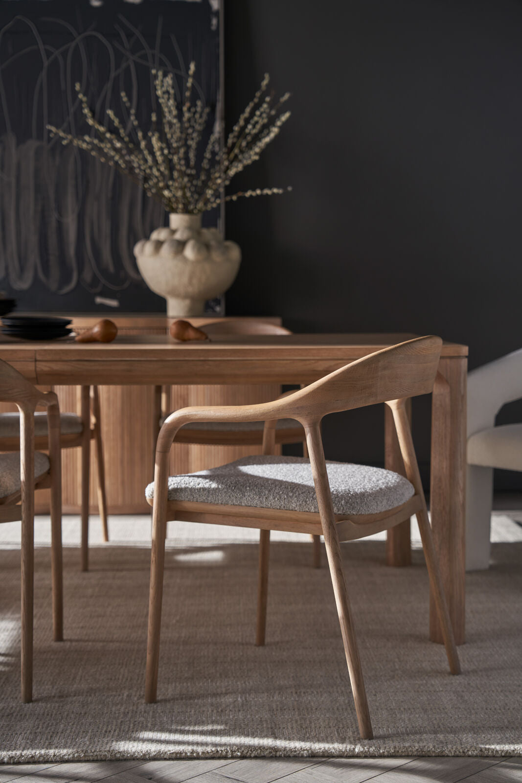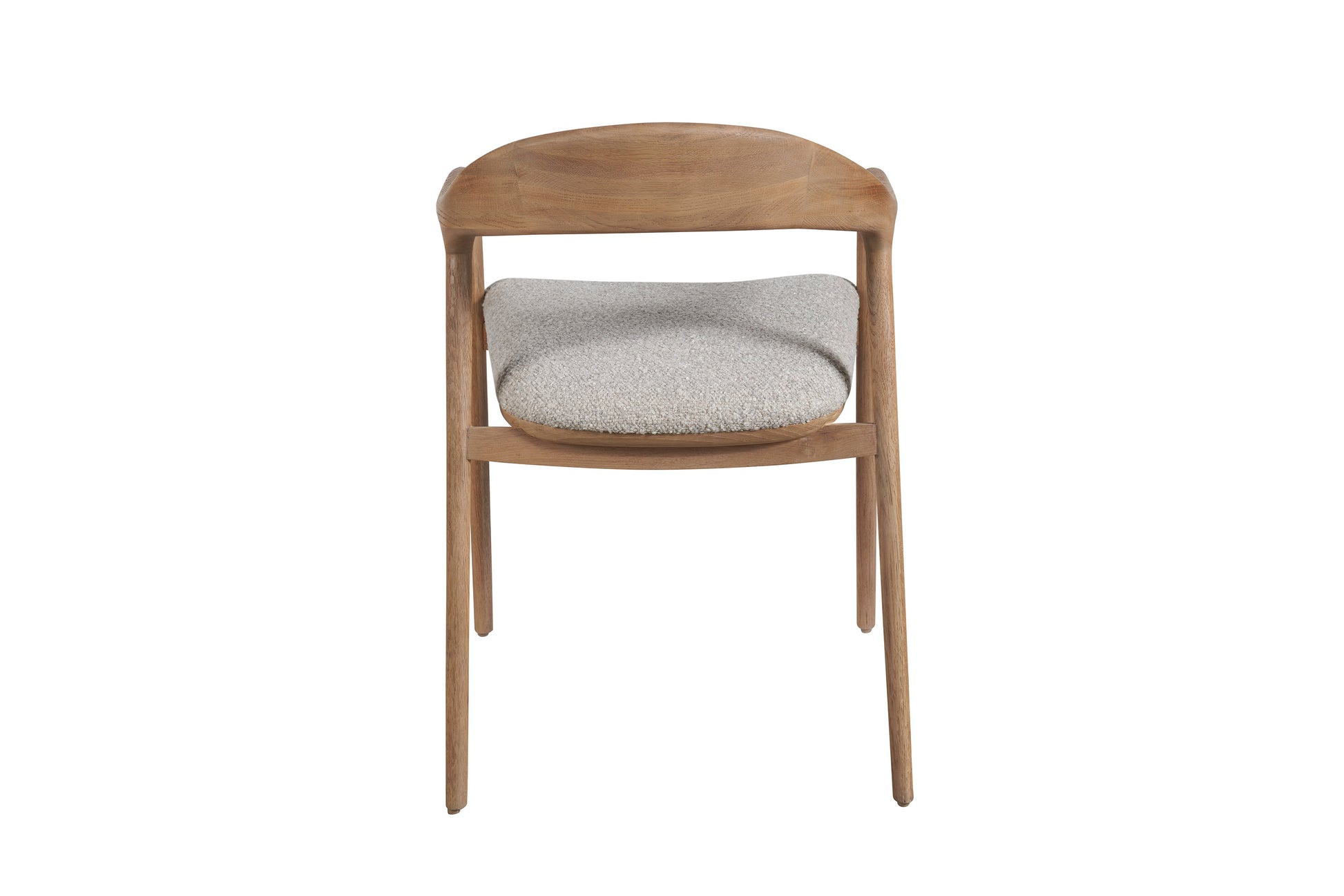 The Echo Dining Arm Chair, available in several finishes and upholstered in the refined Medina Pebble fabric, encapsulates elegance with its rounded, open-air back design. Its lithe, straight legs and gently curved back exude a sleek, streamlined form, imparting an aura of sophisticated airiness to the modern dining ensemble.