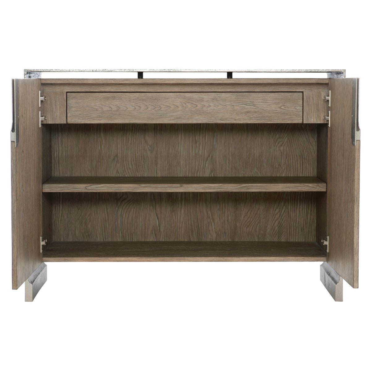 Shimmering aluminum meets rustic white oak in this finely crafted, distinctly modern door chest.