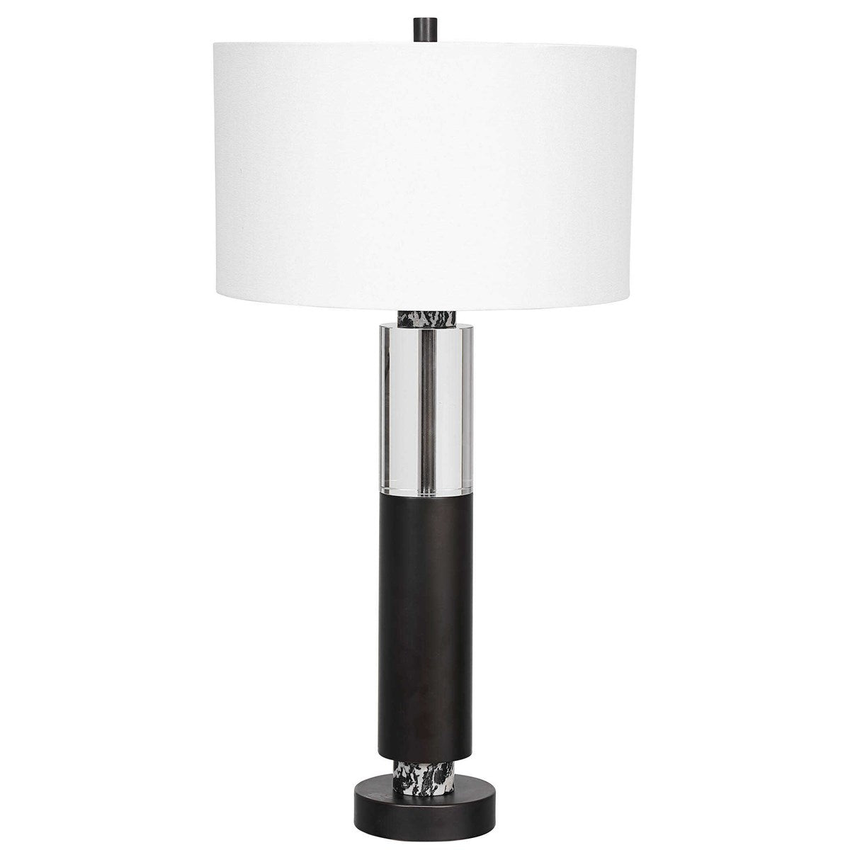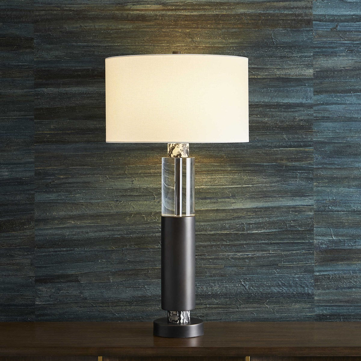 Stylish and sophisticated, the Emporoar Table Lamp has a large optic quartz accent atop a blackened steel column with semi-precious zebra stone accents. The light from the lamp creates depth and drama when shining through the crystal. A hardback drum shade covered in a white linen fabric completes this lamp. Lamp has a 3 way socket switch and an 8' clear silver cord.