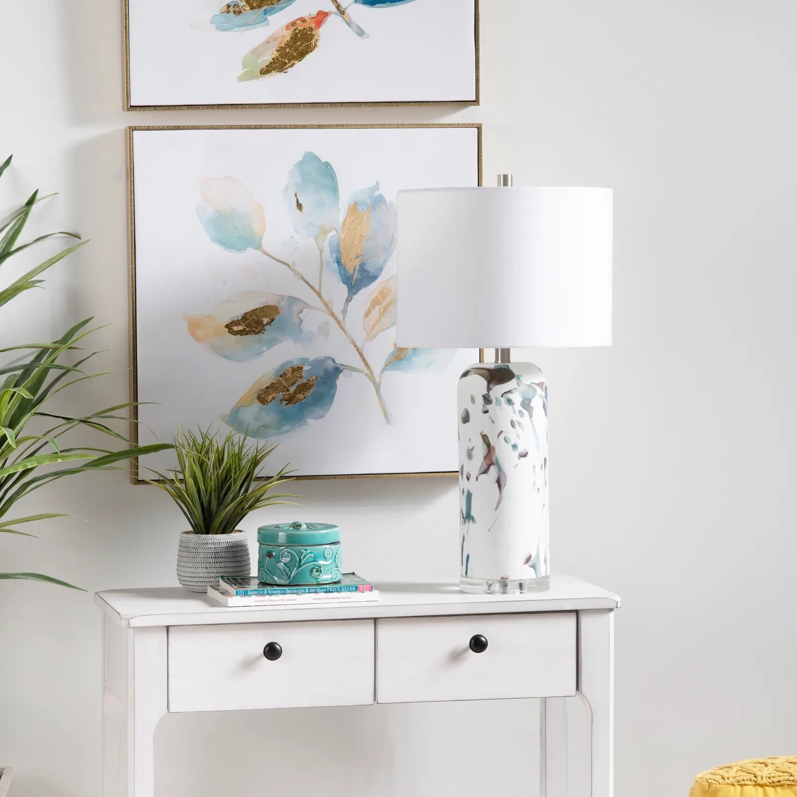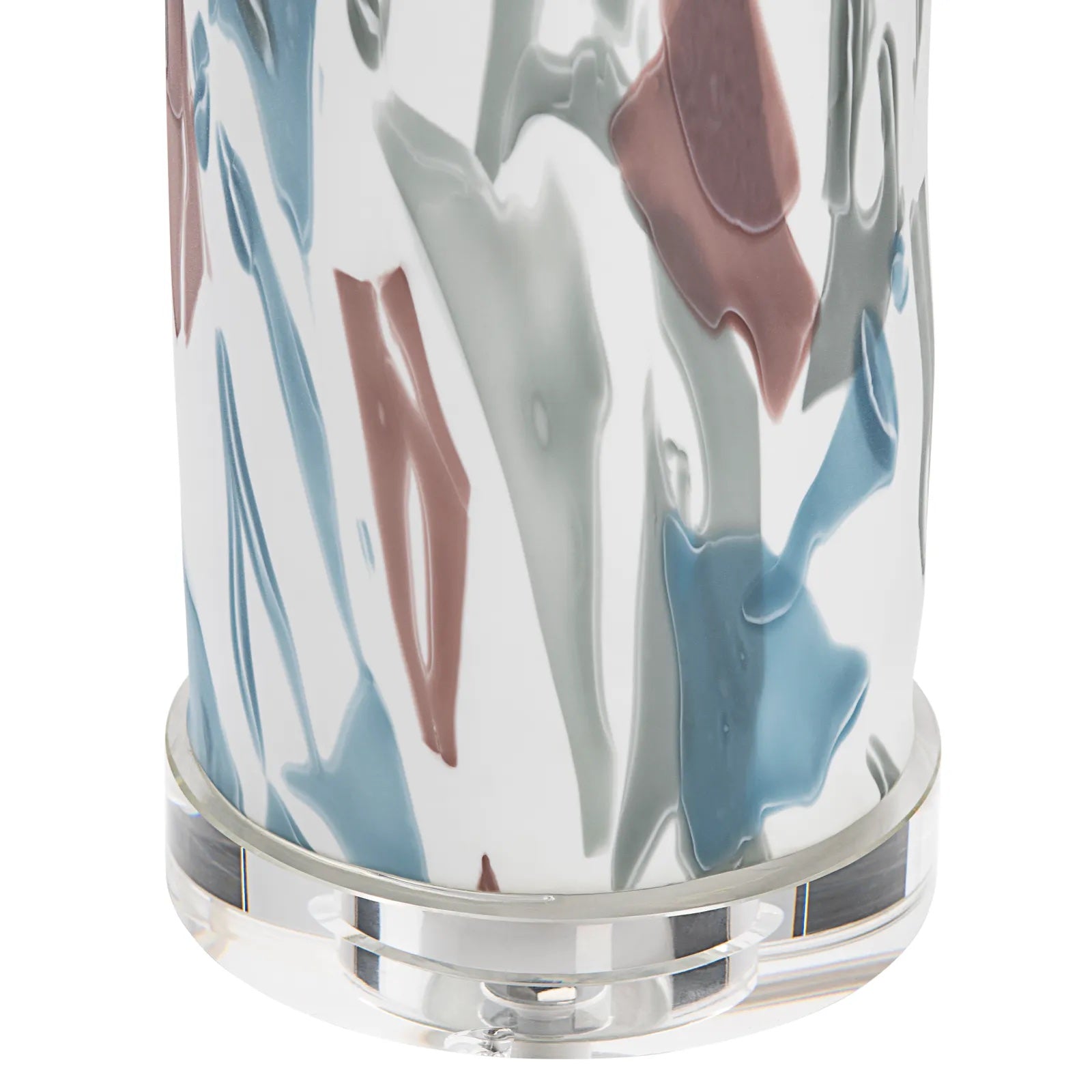The Everly Artisanal Glass, Crystal Base Lamp comes in a set of two. The multi-colored ceramic body of the lamp sits atop a crystal clear base and the abstract colors of blue, brown and grey on a cream background will guide your eye to the gold post that supports the cream colored round shade. This will add a perfect splash of color with the lamps set on either side of a sofa, entryway table or sideboard in your transitional style home or office decor.