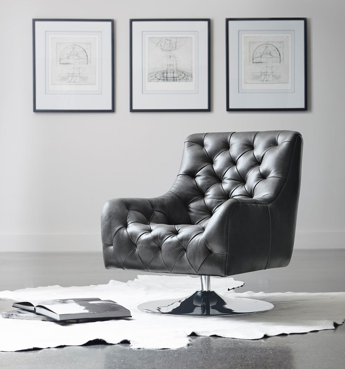 The Finn Swivel Chair by Bernhardt will have your interior looking fabulous. With its quilted sophistication in sumptuous leather and its sleek swivel base in polished stainless steel, this chair will add elegance to your home décor.