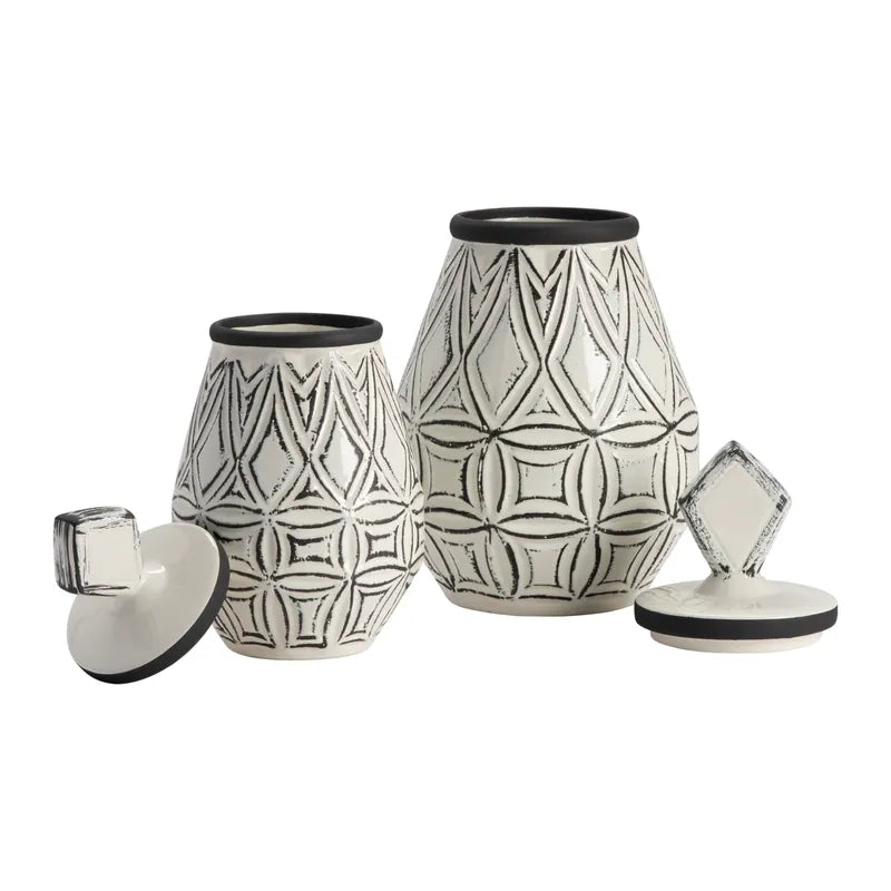 The Geometrical Farmhouse Vases includes two vases of different sizes. Both vases are made of ceramic with a white finish. Black details create a geometrical design and complement the black band around the lid. Each lid features a diamond-shaped handle. These traditional-style vases add a charming element to your home decor.