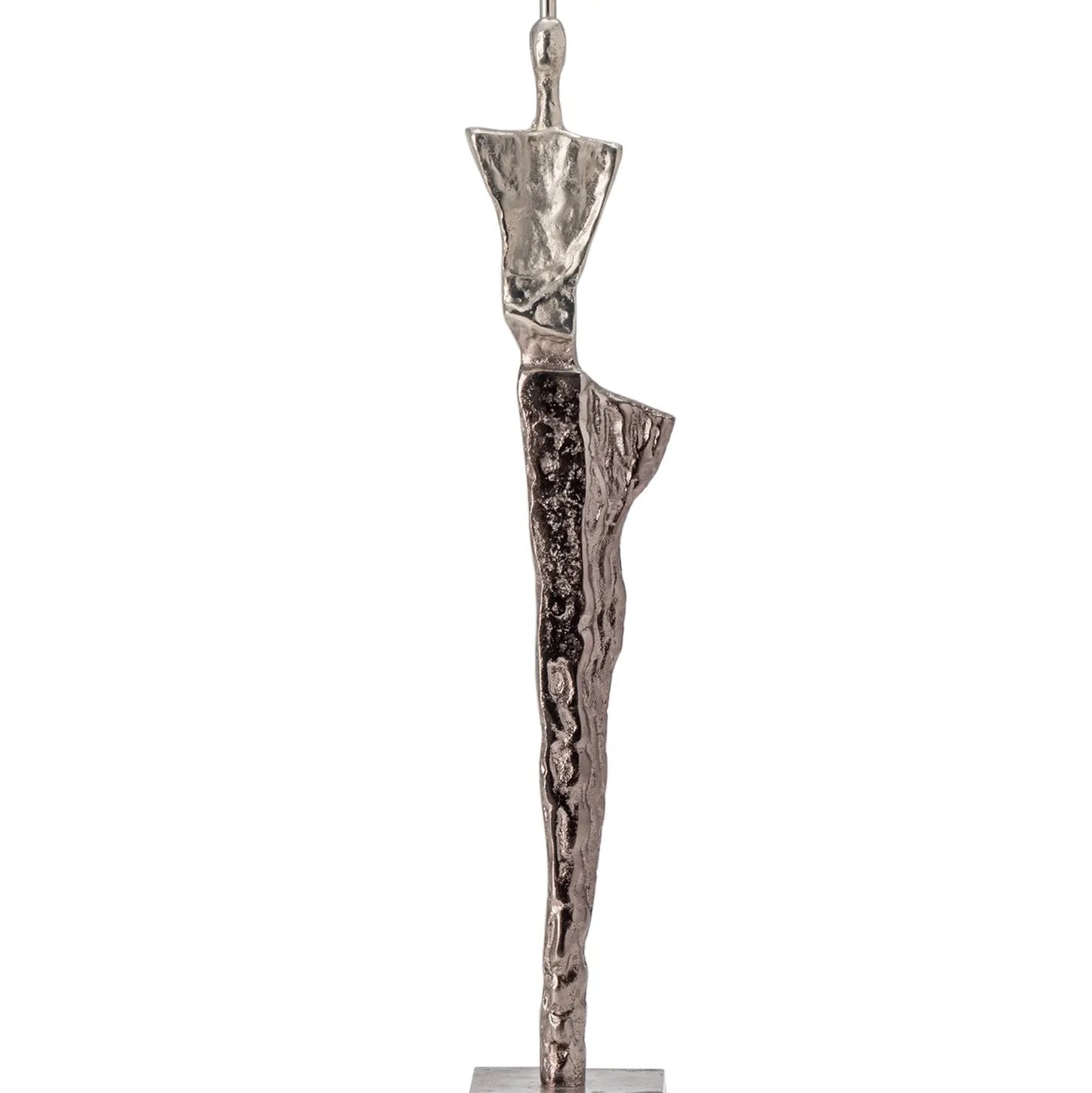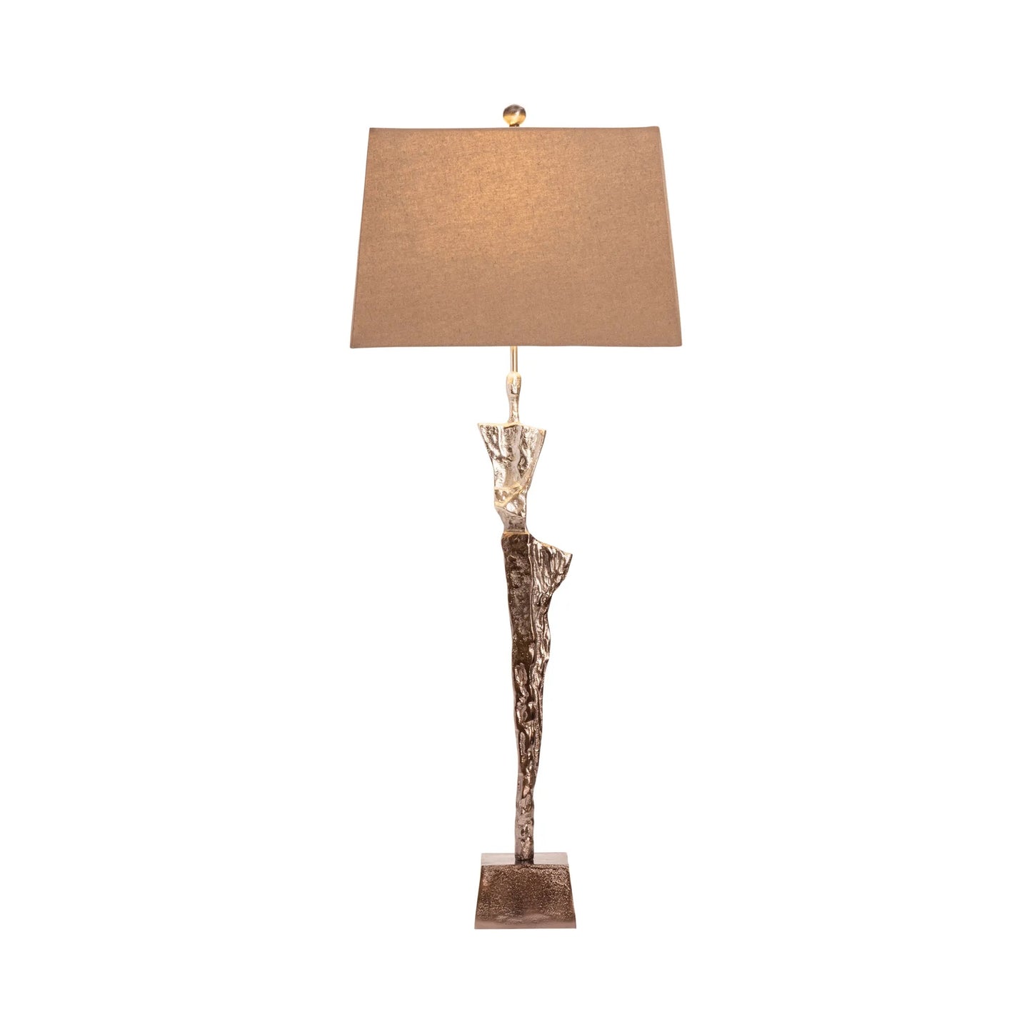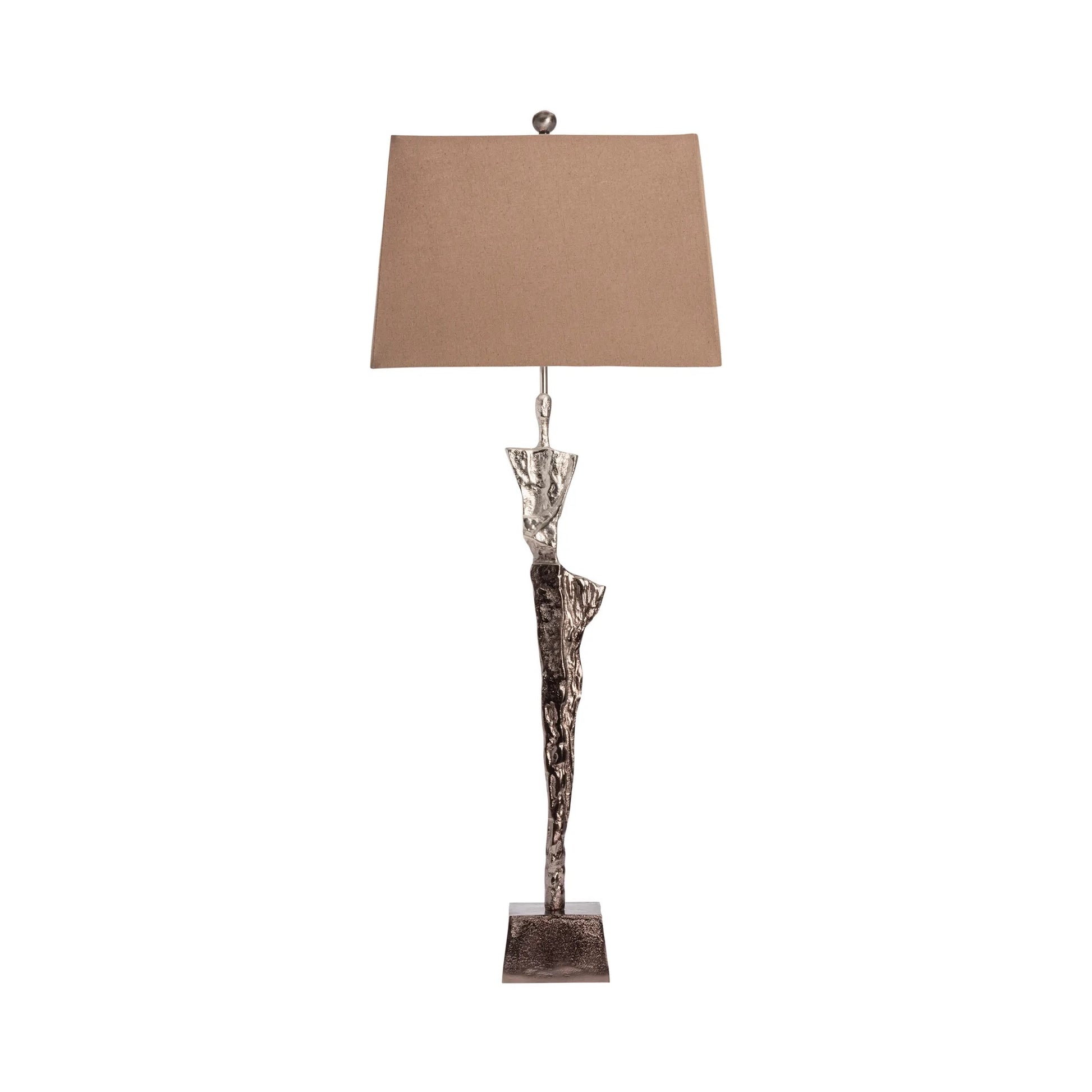 The M Décore Giacometti Sculptural Buffet Lamp is inspired by the works of sculptor Alberto Giacometti. This modern lamp features a sculpted body with an ombre bronze to silver finish. The lamp's metal construction is complemented by the tapered rectangular shade, which also features a bronze color. The warm tones of this piece will bring a rich, sophisticated air to any room.