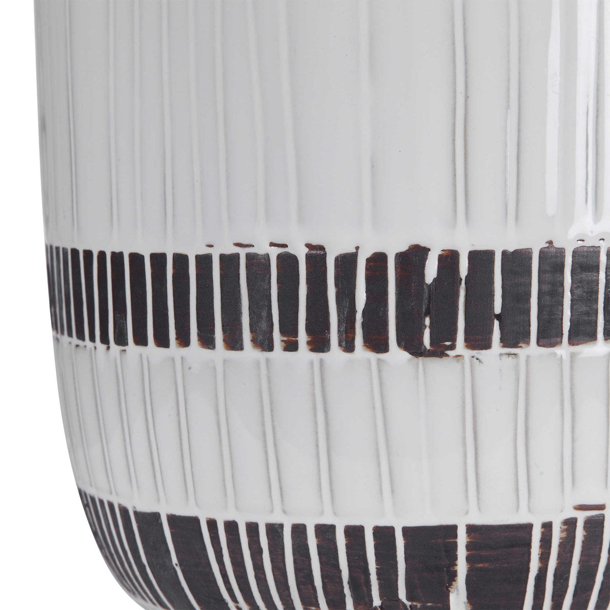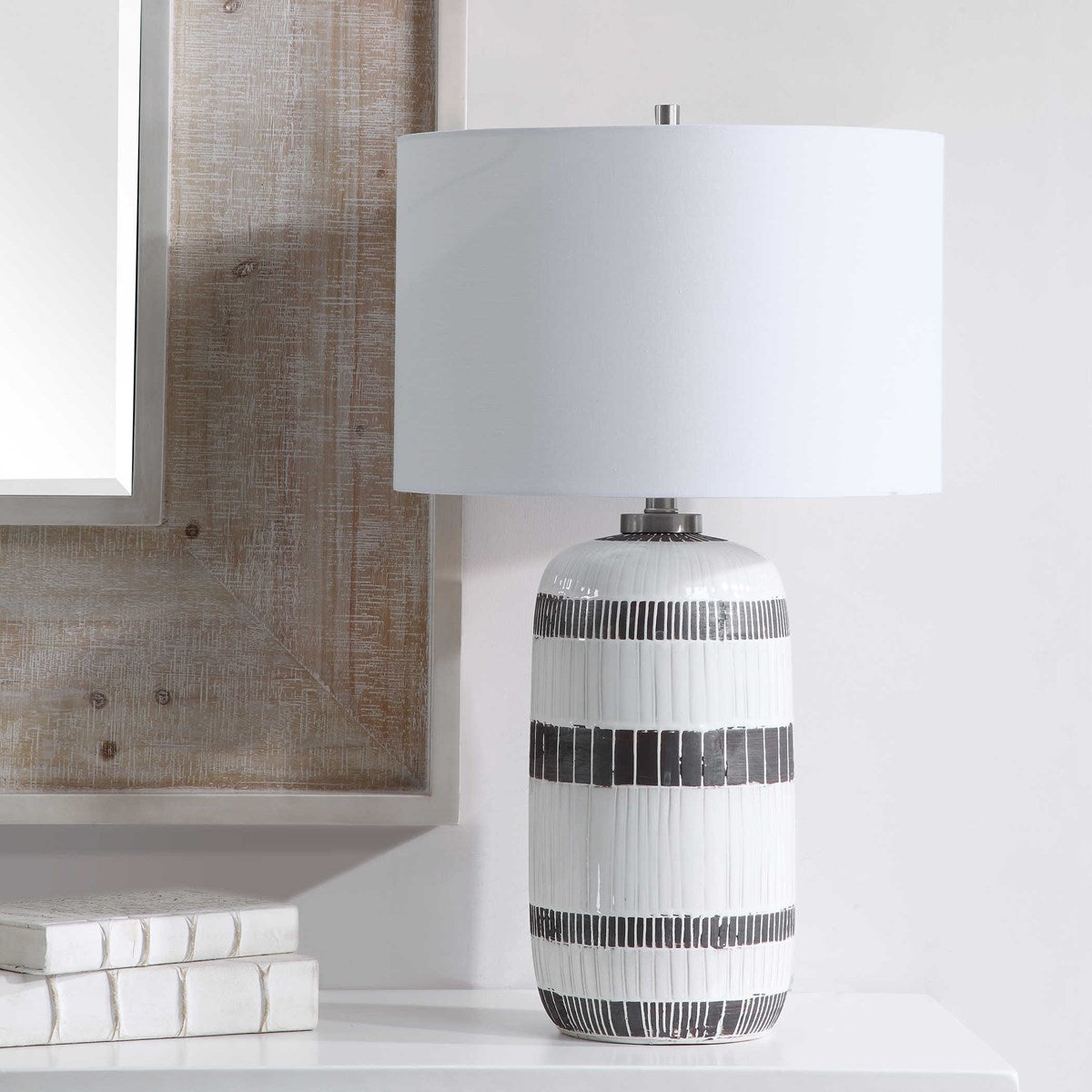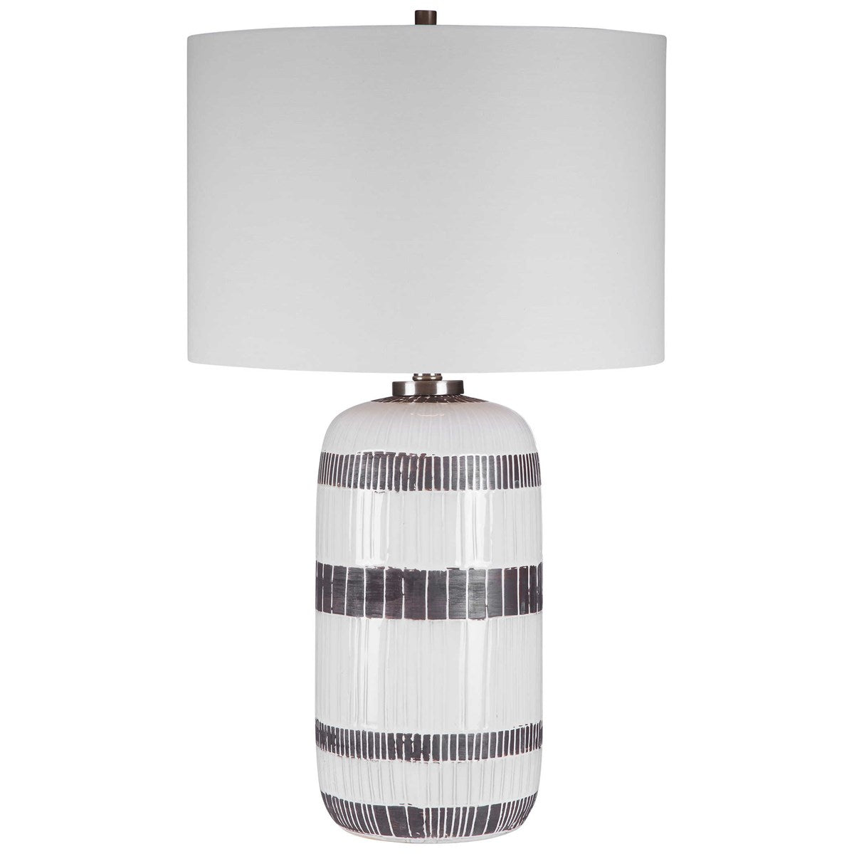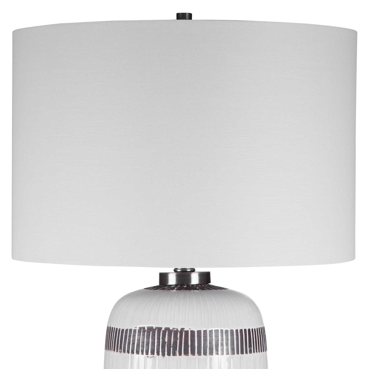 Add a touch of lodge style to your space with this ceramic table lamp. The base features vertical embossed texture finished in an aged white glaze with dark, chocolate brown details, accented with brushed nickel details. The hardback drum shade is a white linen fabric.