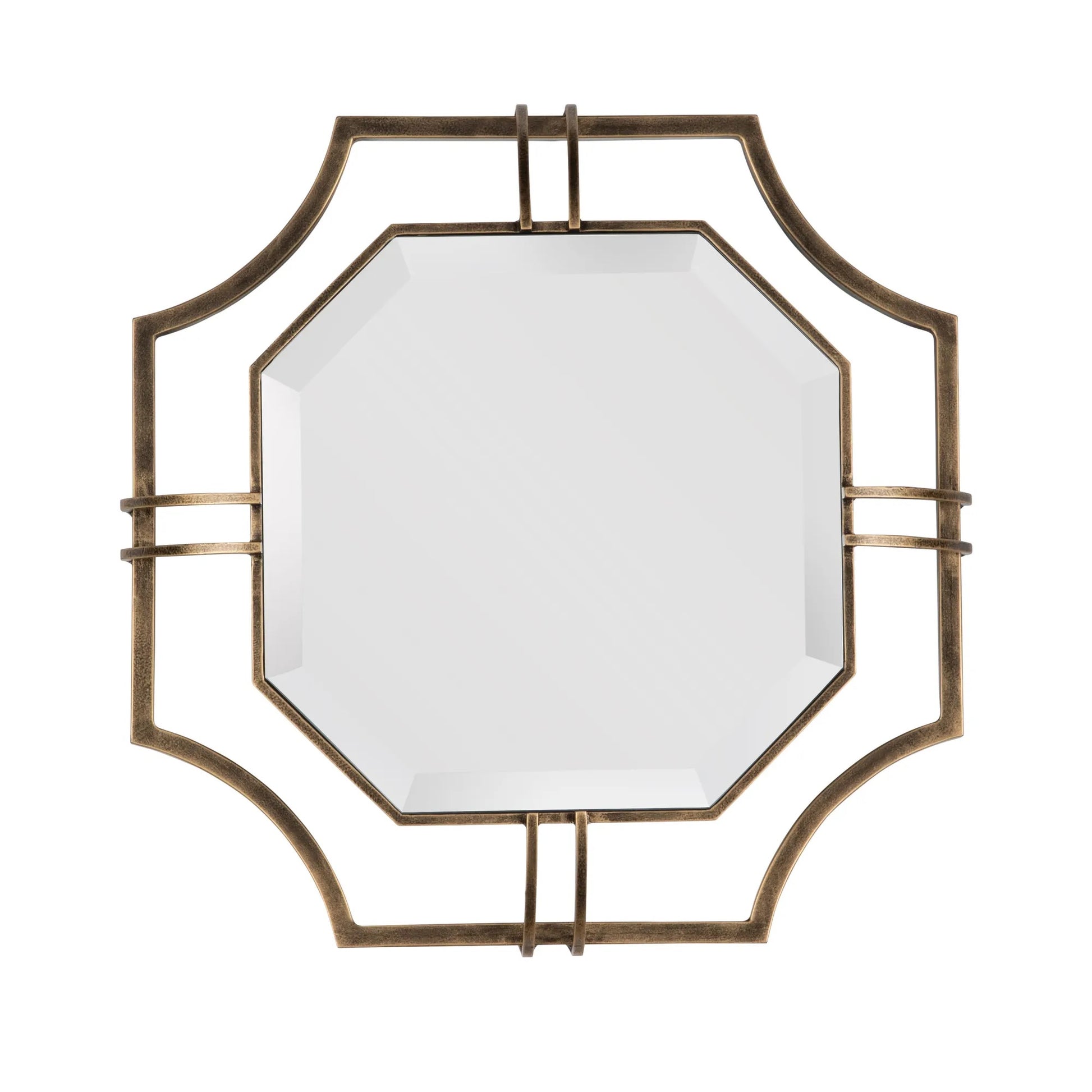Add regal style to your home with this M Décore Henson Floating Octagonal Beveled Mirror in Antique Brass Frame. The ample mirror gives you room to check your look on the way out the door, or to reflect additional light into your space. The beveled edges and floating bronze finish frame are simply gorgeous.