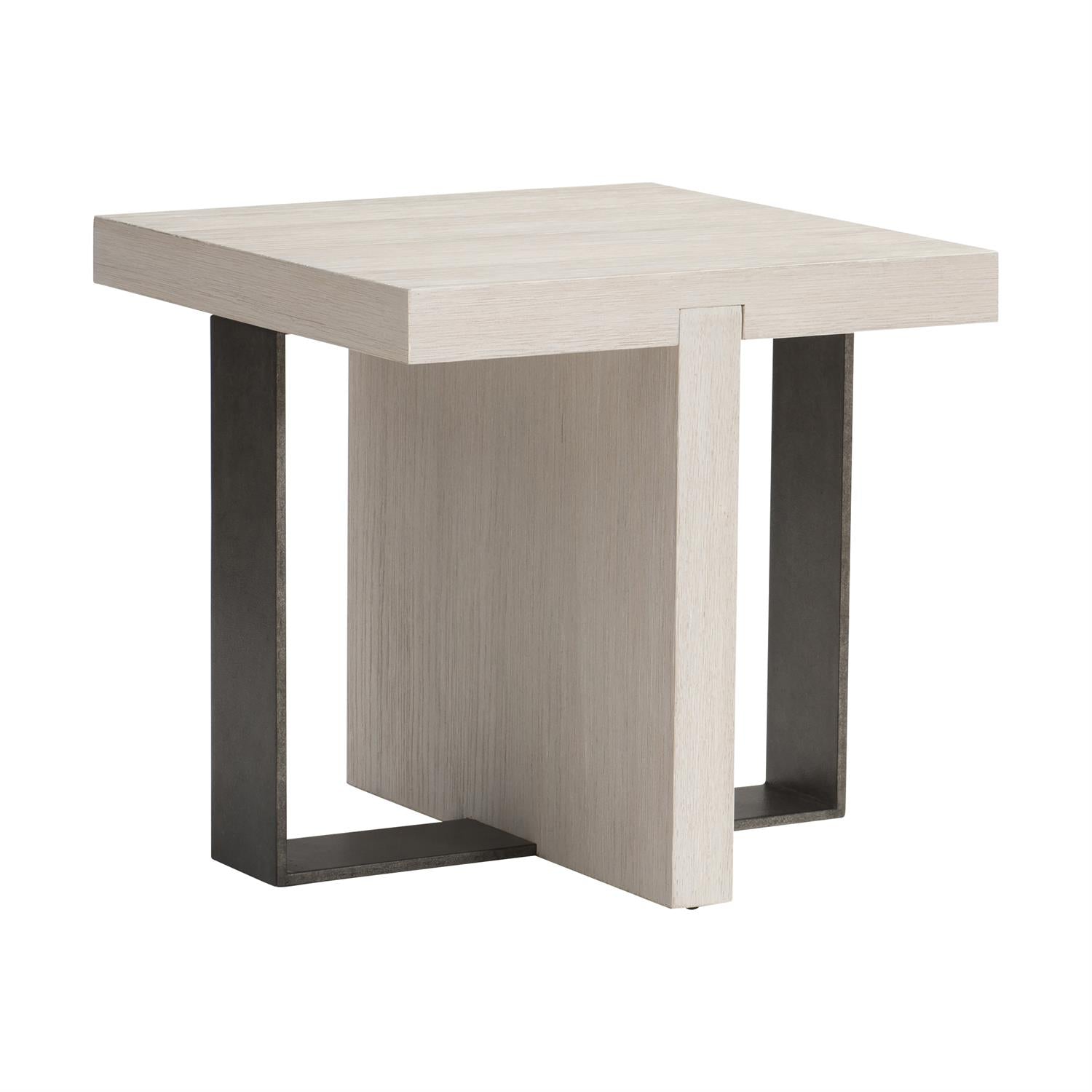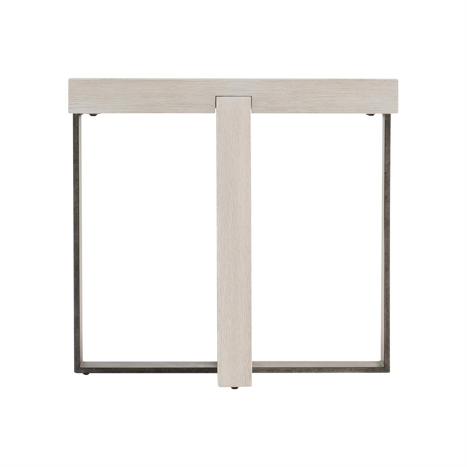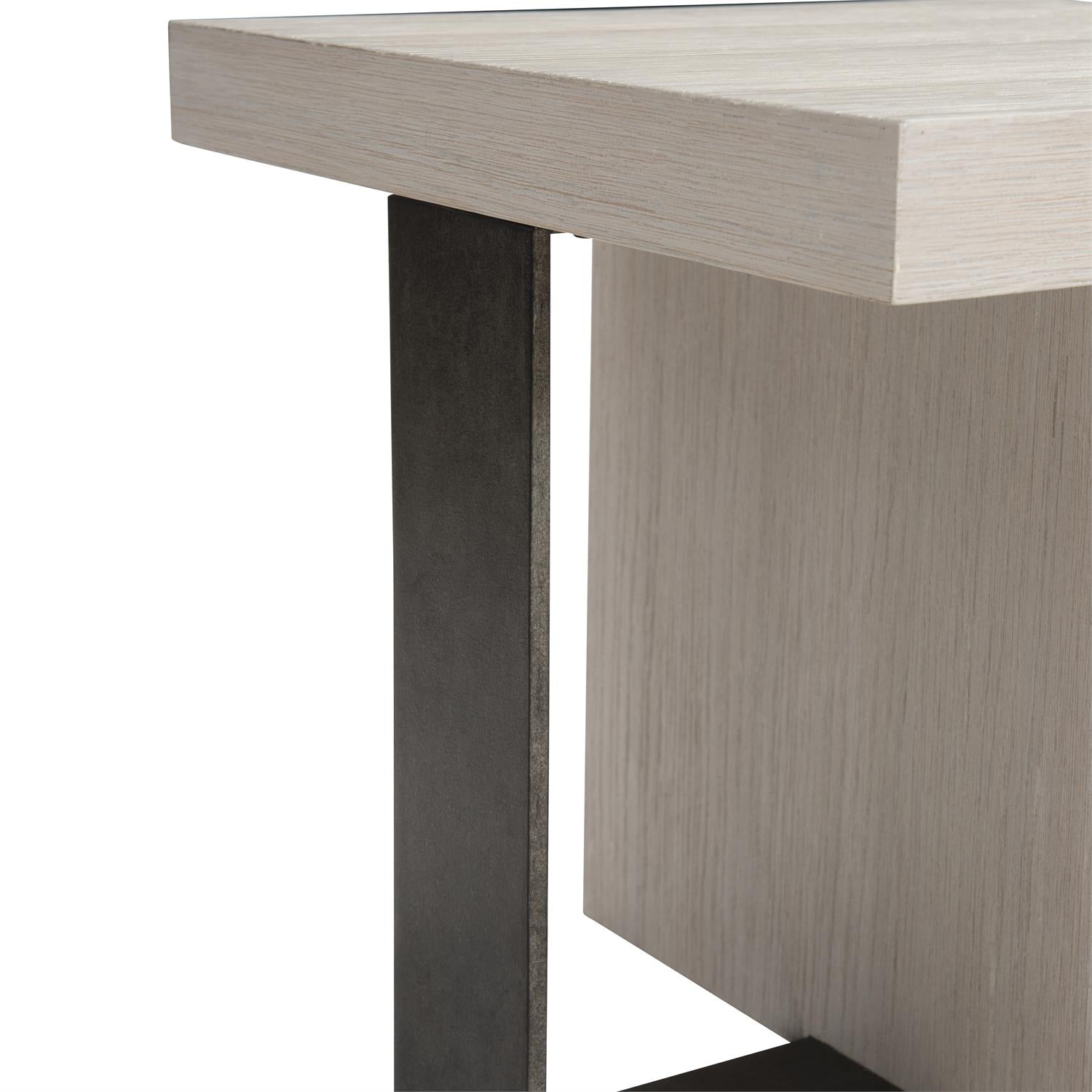 Architectural inspiration is evident in the Hoban side table. Intersecting panels of wood in Weathered Bone finish form the top and center support, balanced on a u-shaped frame of textured steel. The center panel fits into the top like the perfect puzzle piece.