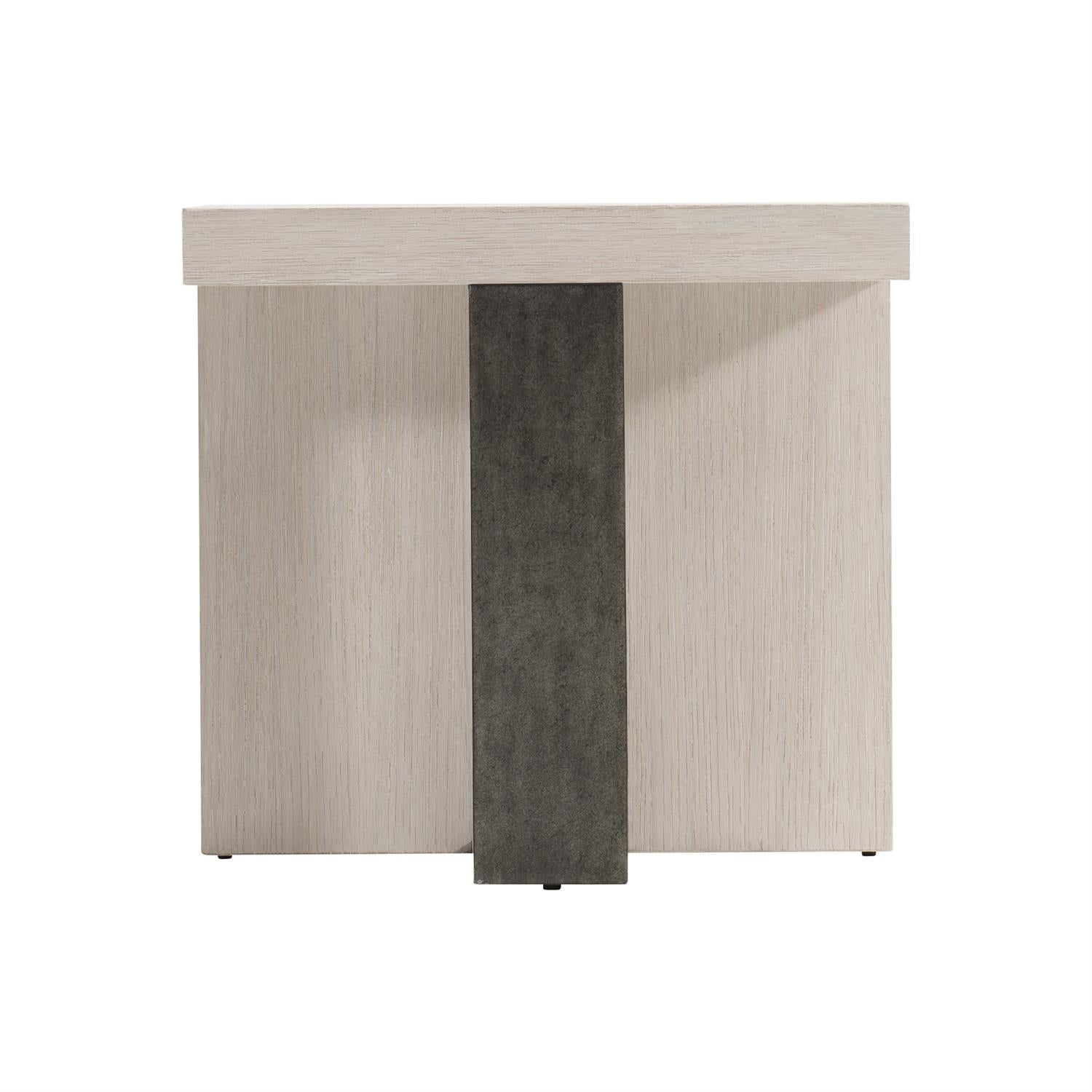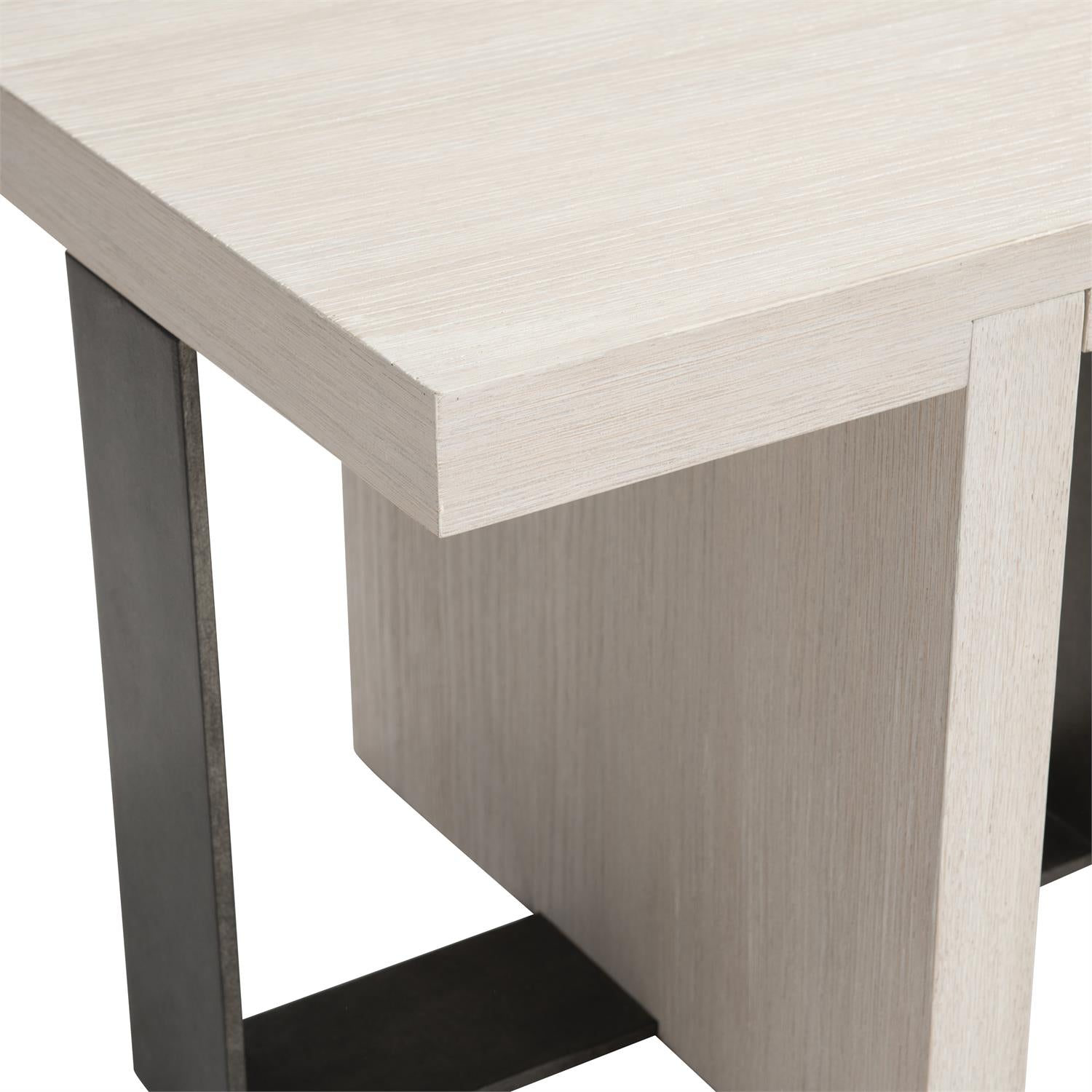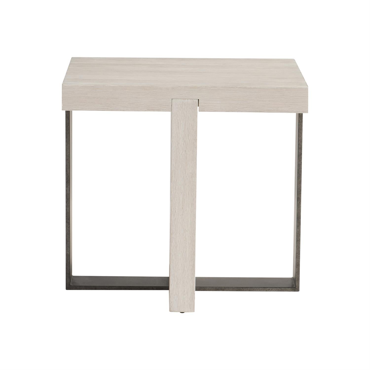 Architectural inspiration is evident in the Hoban side table. Intersecting panels of wood in Weathered Bone finish form the top and center support, balanced on a u-shaped frame of textured steel. The center panel fits into the top like the perfect puzzle piece.