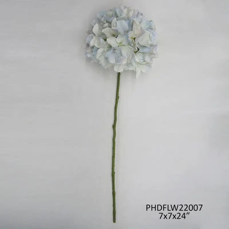This fabric crafted hydrangea is hand-dyed to resemble the soft, new blue color of early season garden hydrangeas.