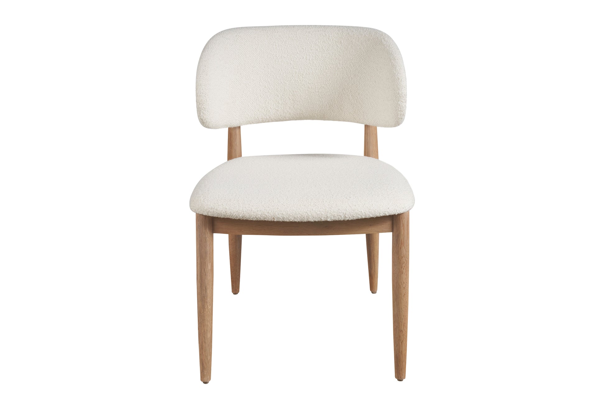 The Juno Side Chair, available in a Natural Oak finish, marries sleek minimalism with cool geometric inspiration. Its Berber Snow fabric seat contrasts beautifully against angled legs, creating a piece that's as visually engaging as it is comfortable, embodying the essence of modern sophistication.