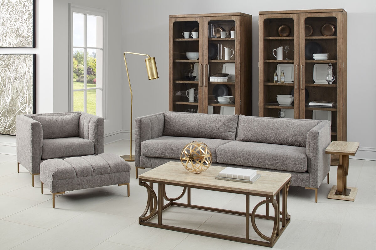 Boldly artistic lines meet welcoming softness in the Kahlo collection, featuring vertical channel tufting with down blend and foam-wrapped back and seating cushions. Corner brackets finished in a brass tone frame these pieces like the works of contemporary art they truly are.
