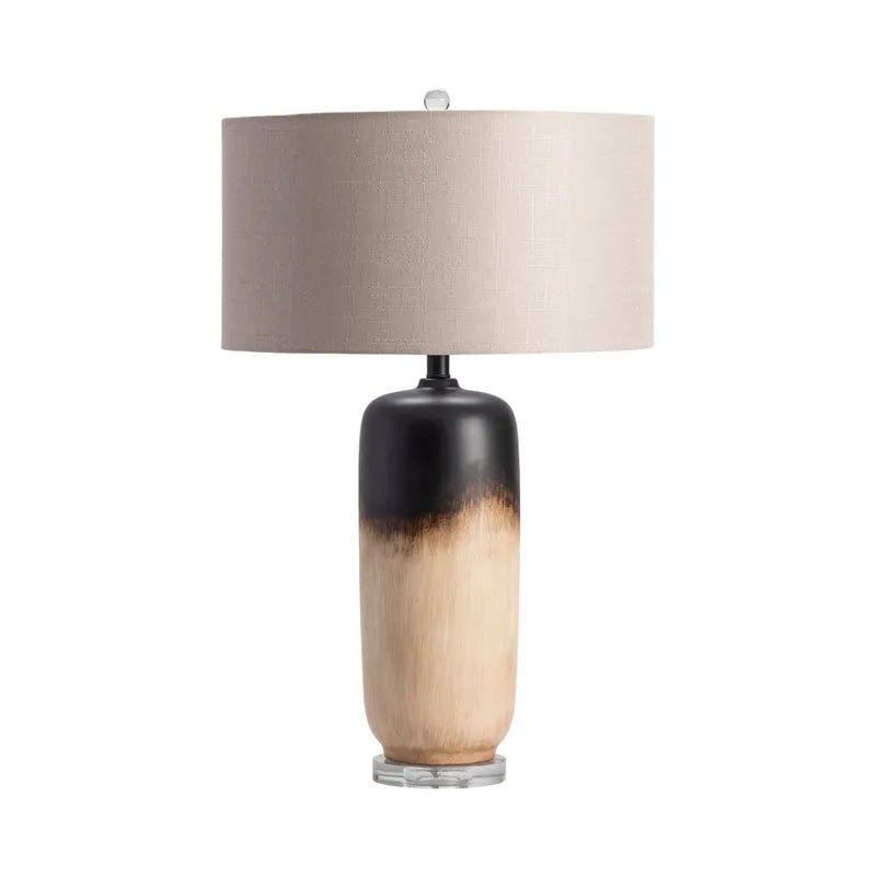 The Latina Table Lamp adds a homey look to your space. The variegated earth tones of black, cream and gold allow it to stand out it any home. The ceramic body features a matte glaze finish, adding a level of casual sophistication to the piece. A crystal sub-base and shallow gray drum shade complete the design of this transitional lamp.