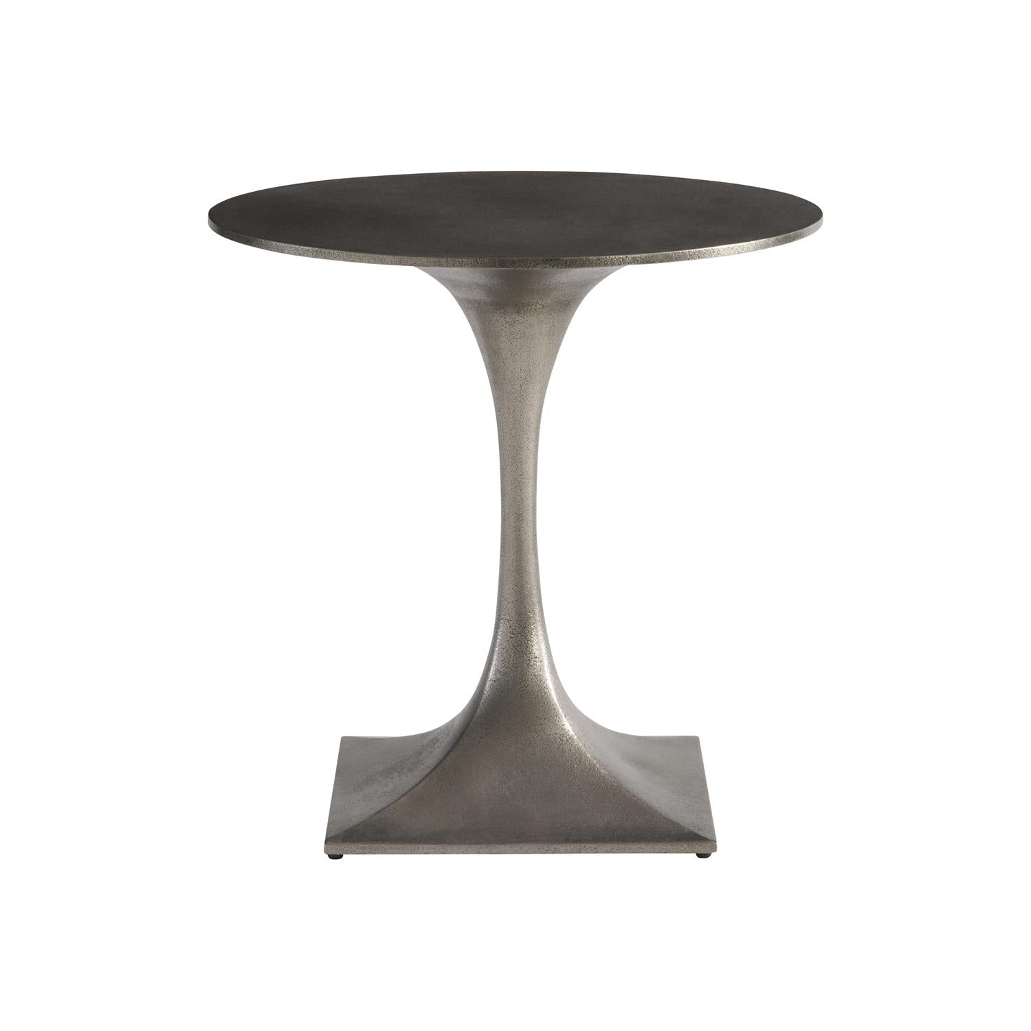 Elegant curves create a sophisticated look in textured metal on the Liguria outdoor side table. Rising from a squared base, the cast aluminum pedestal flows to the slim round top, all in the Graphite finish.