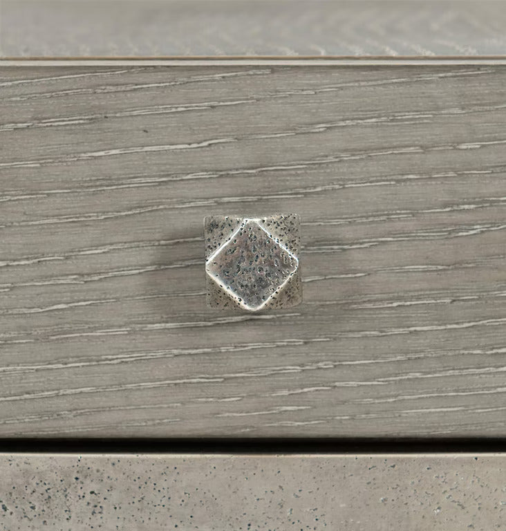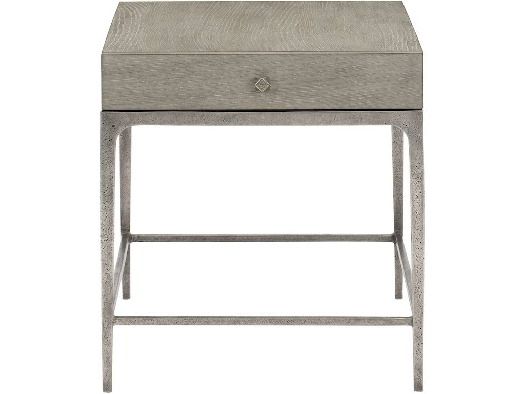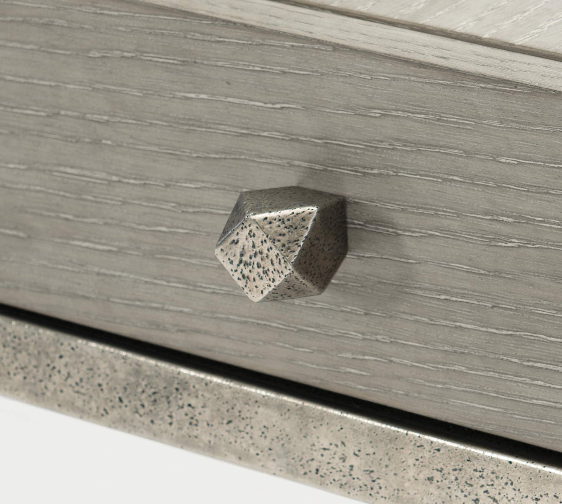 With the Linea end table, the drama lies in the contrast between the unique finishes and materials. Wire-brushed oak veneers in a Cerused Greige finish add subtle textures while leaving a white hang-up in the grain. The rustic look partners elegantly with the sleek cast aluminum base in a complex Textured Graphite finish. A faceted metal knob adds a jewelry-like feel to this sophisticated piece.