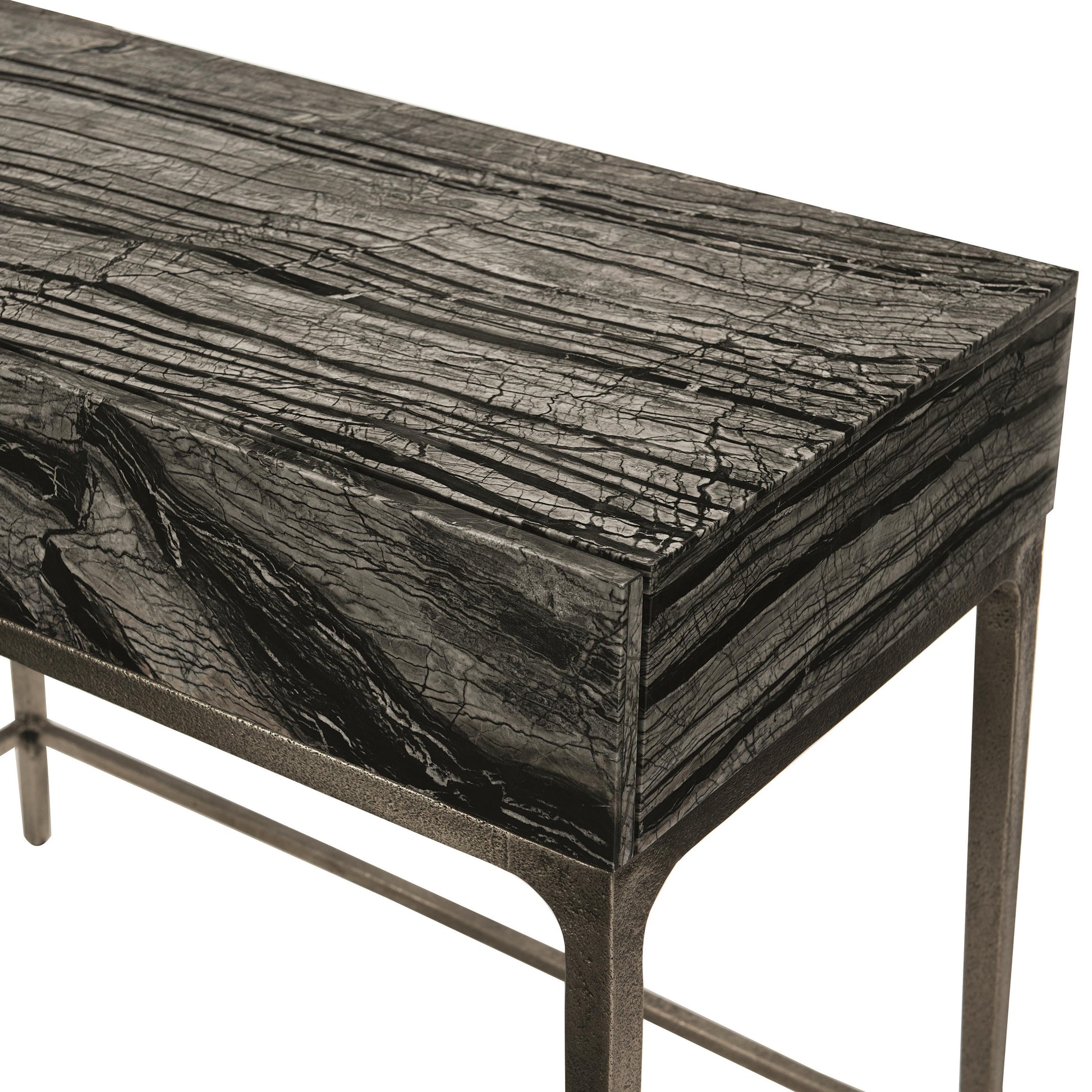 With this rustic modern nightstand, the drama lies in the contrast between heavily textured metal and boldly striated Black Forest marble.