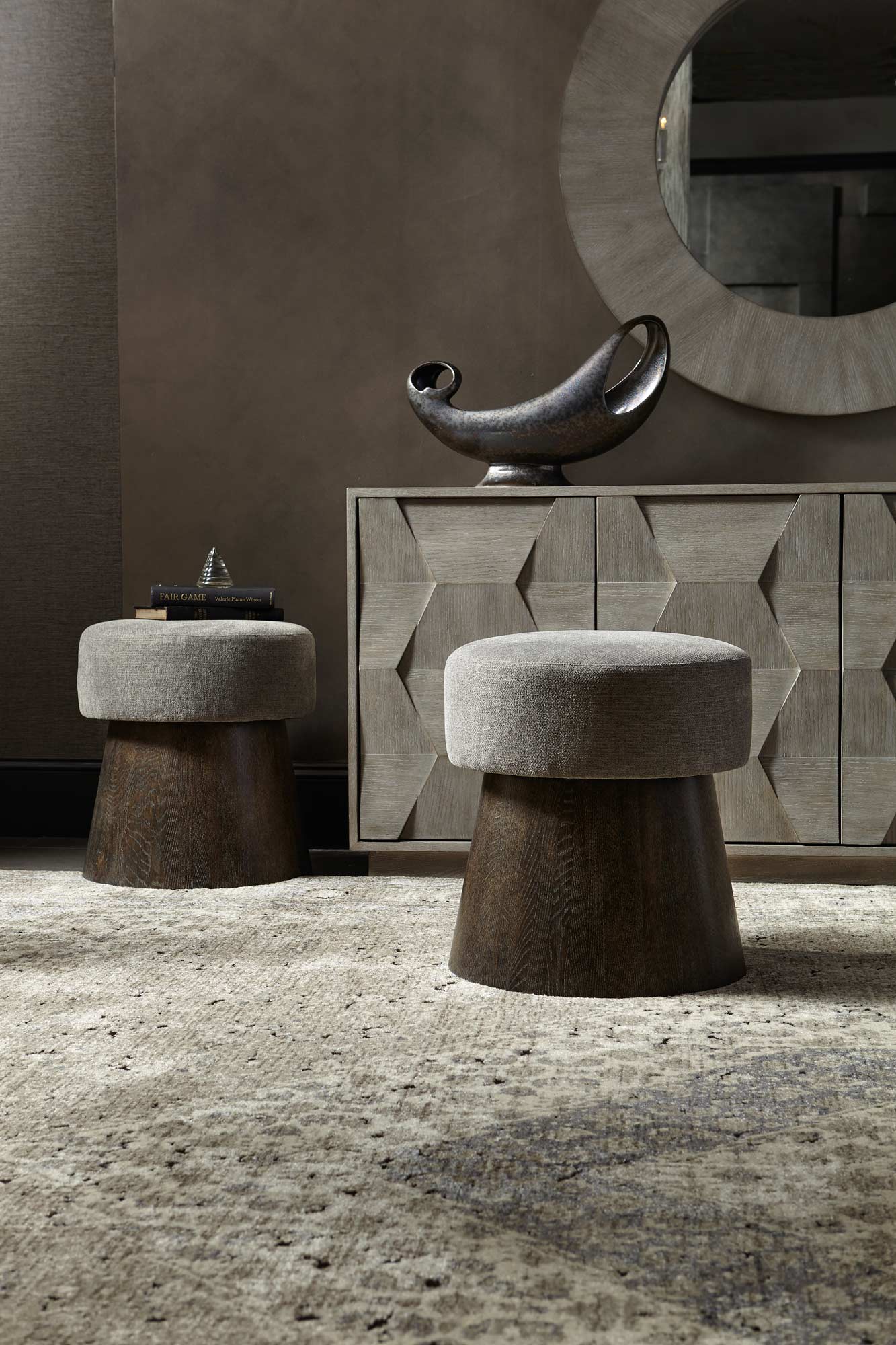 With an artistic, modernist sensibility, the Linea round bench experiments with function and form. In this unique geometric design, a round upholstered seat rests on a conical base featuring wire-brushed oak veneers. The Cerused Charcoal wood finish pairs elegantly with the gray fabric tone. An understated elegance emanates from the simple form and subtle textures of this piece.
