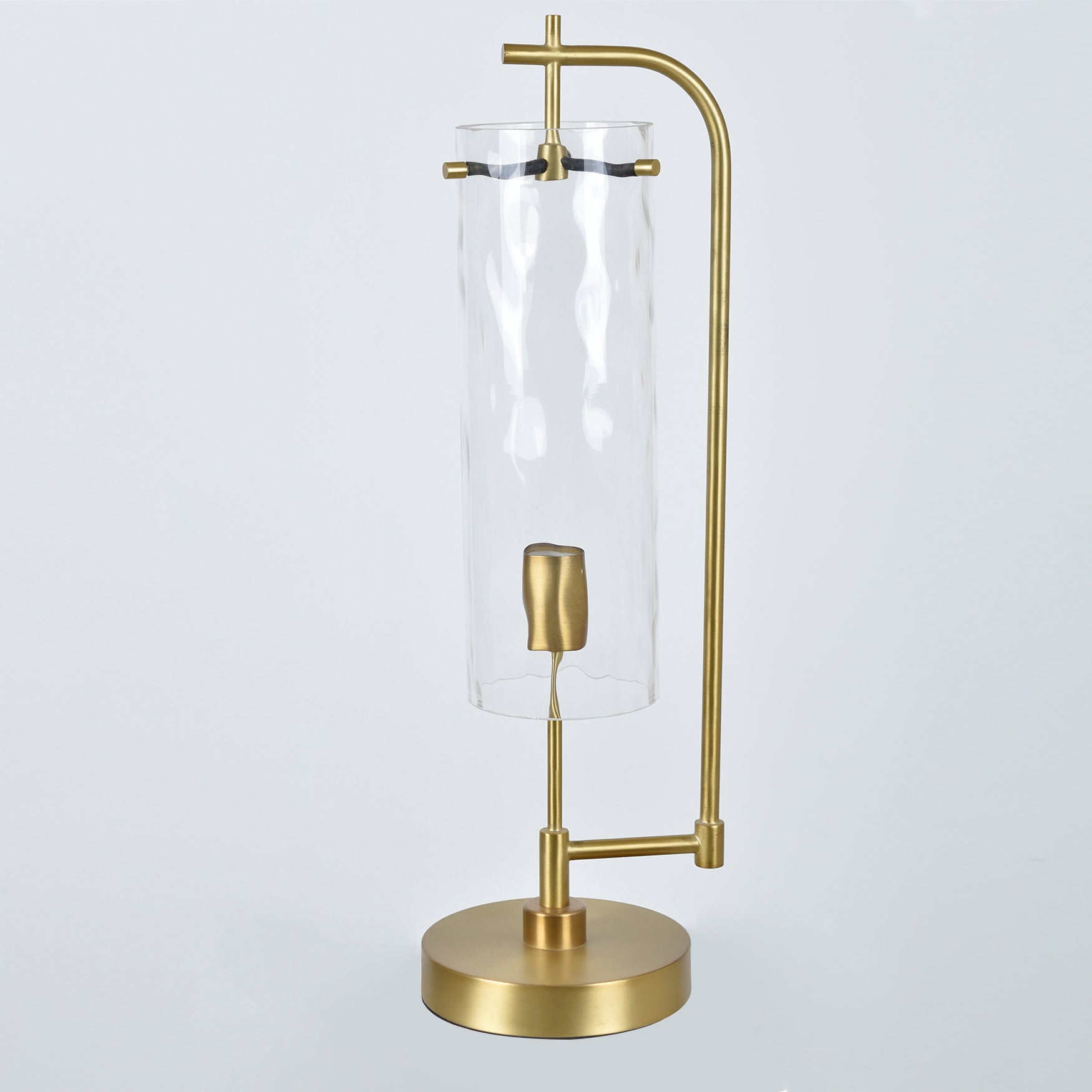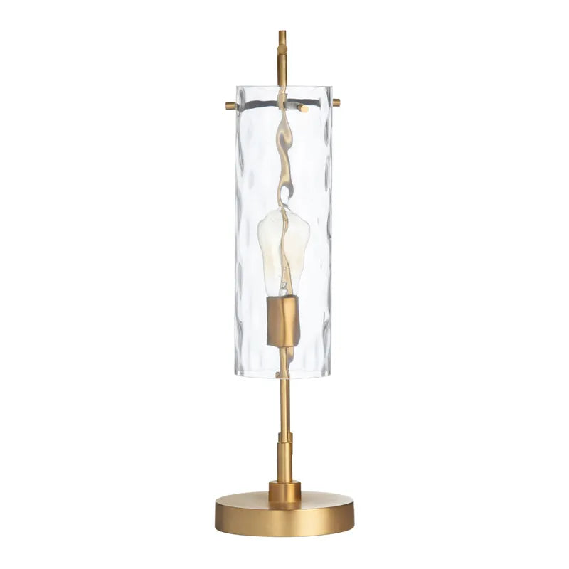 At its core, the Lullisto Table Lamp features a clear, beveled glass shade that is suspended from the top, creating an illusion of weightlessness and defying traditional design conventions. The transparent glass shade casts light from all directions, making it a statement piece that transcends functionality. The brushed gold metal body is the framework for this unique lamp and is the perfect, glistening choice for any space.