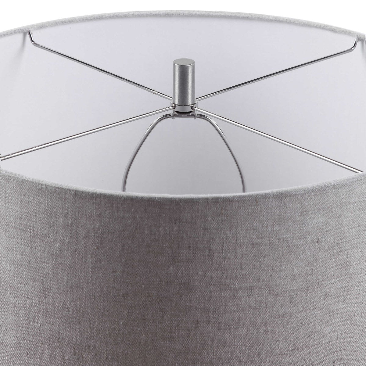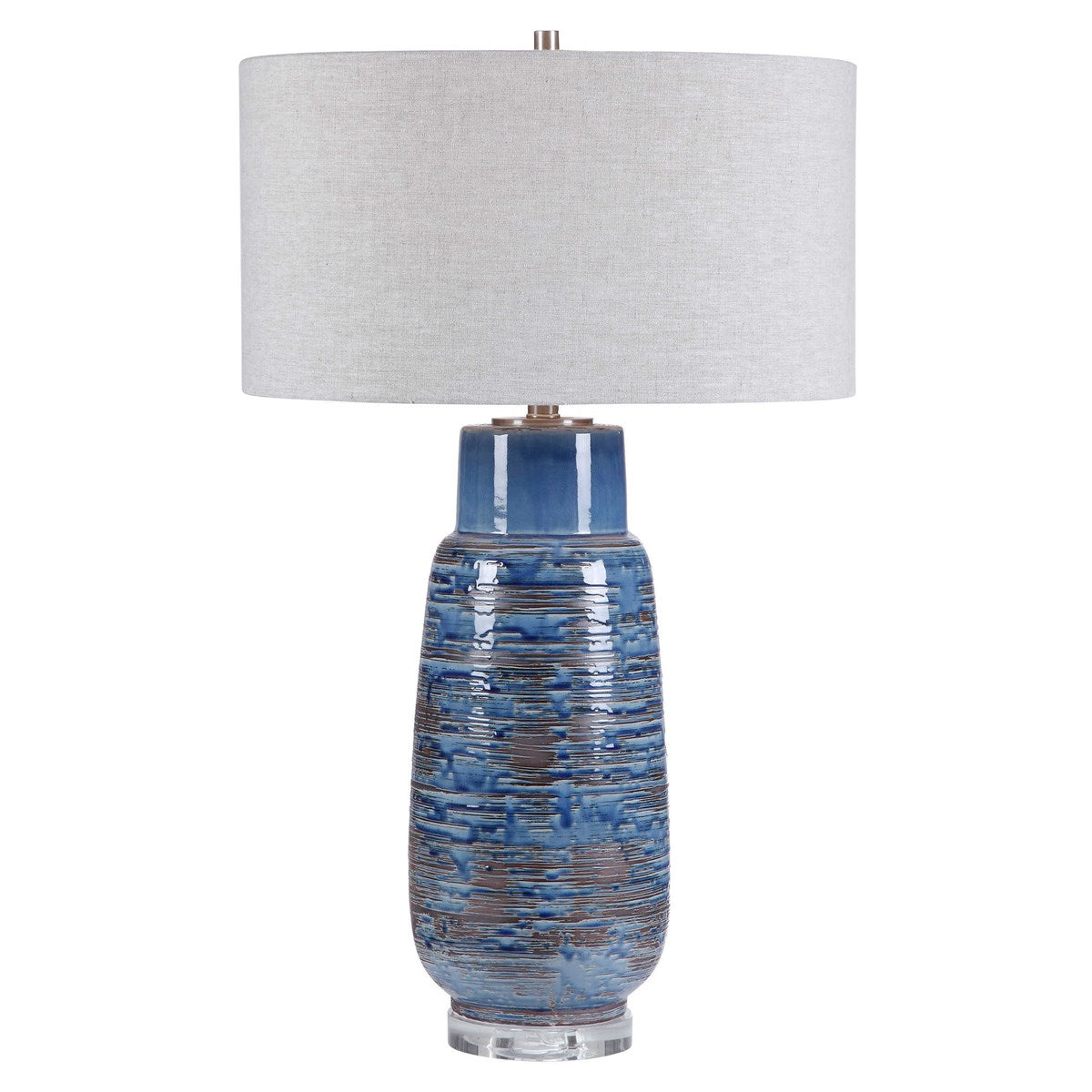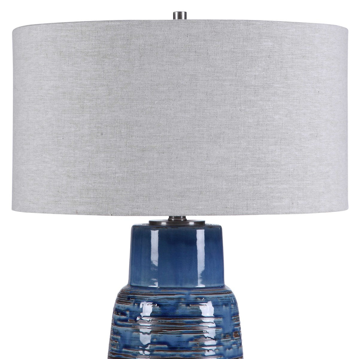 This table lamp features a tall ceramic base in a heavily distressed aged indigo blue drip glaze with dark rust bronze undertones. A thick crystal foot and brushed nickel plated accents highlight the piece. The lamp has a round hardback shade in a light gray linen fabric.