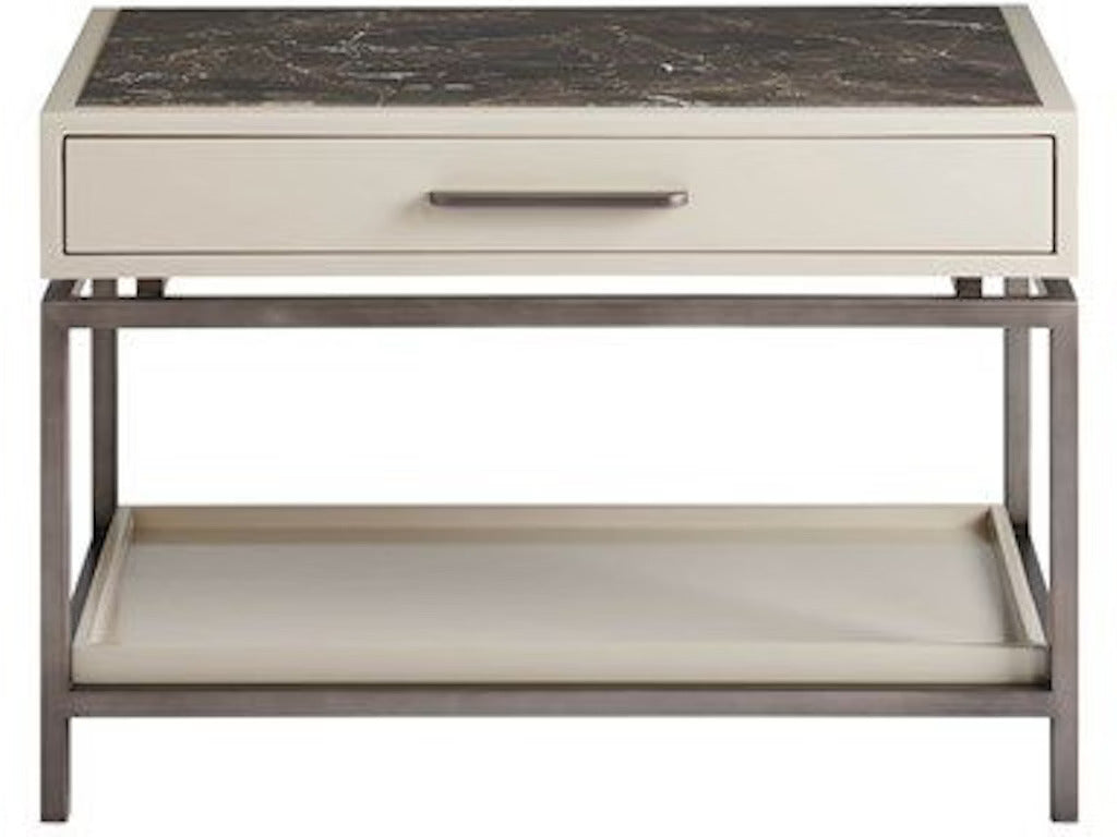 Punctuate bedsides with the Magon Nightstand, a contemporary interpretation of bedroom aesthetics featuring a smooth inset stone top, one drawer, and finished with an open air display shelf.