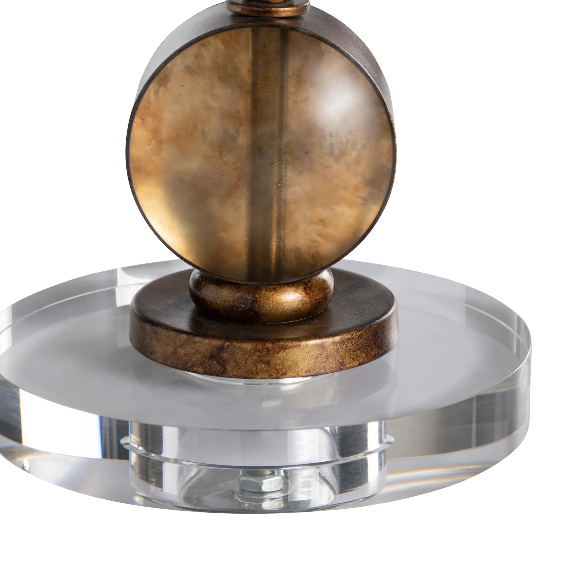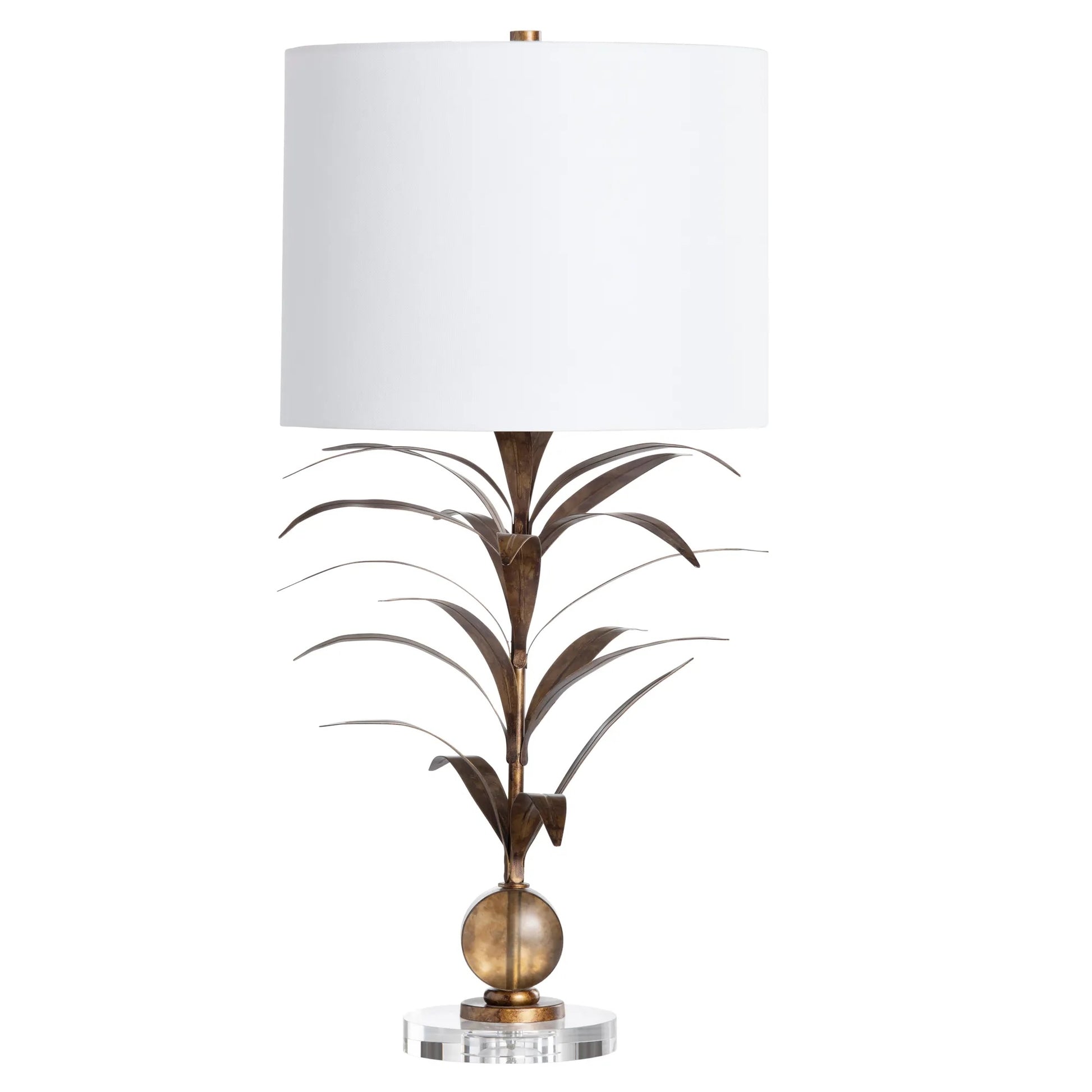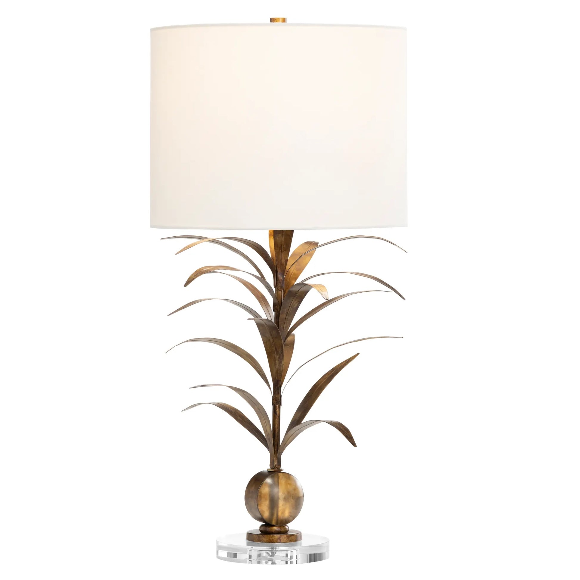 Introducing the Mandalay Stylized Palm Fronds Table Lamp by M Décore – a true masterpiece of design and craftsmanship that brings the allure of the tropics right into your home. The body features a decorative palm frond body, meticulously crafted entirely from metal. Each frond is adorned with a lustrous gold-leaf finish that gleams under the lights and catches the eye. The piece also embellished with a round, amber glass accent that sits upon a crystal-clear base for a touch of luxury. Crowned by a contemporary white linen shade, this lamp exudes an air opulence and contemporary flair.