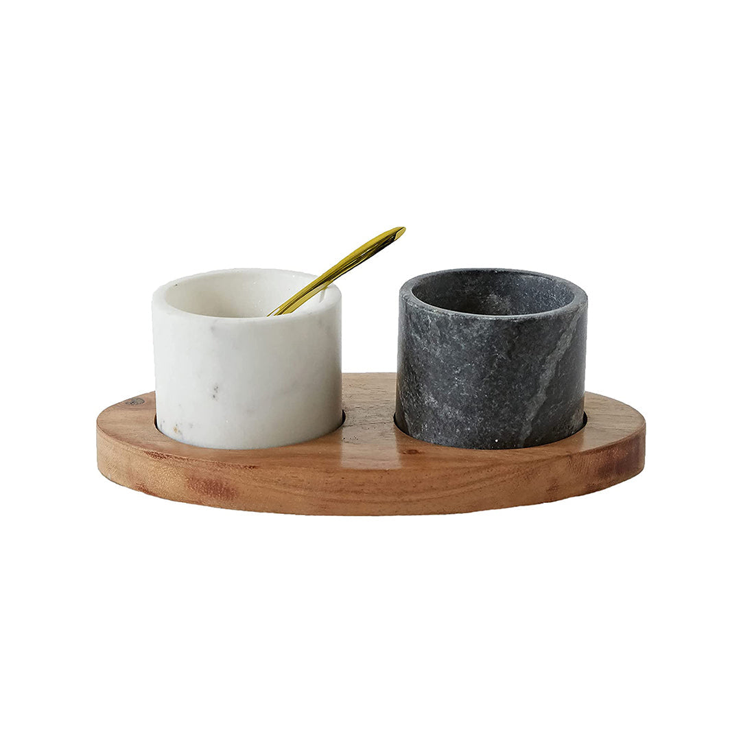 Elevate your entertaining with this sophisticated set, featuring a handcrafted mango wood tray paired with two elegant marble bowls in contrasting white and black. Each bowl is accompanied by a gleaming brass spoon, adding a touch of luxury to your table setting. Perfect for serving dips, condiments, or small snacks, this set effortlessly blends style and functionality. Whether you're hosting a gathering or looking for a unique gift, this set brings timeless charm and practicality to any occasion.